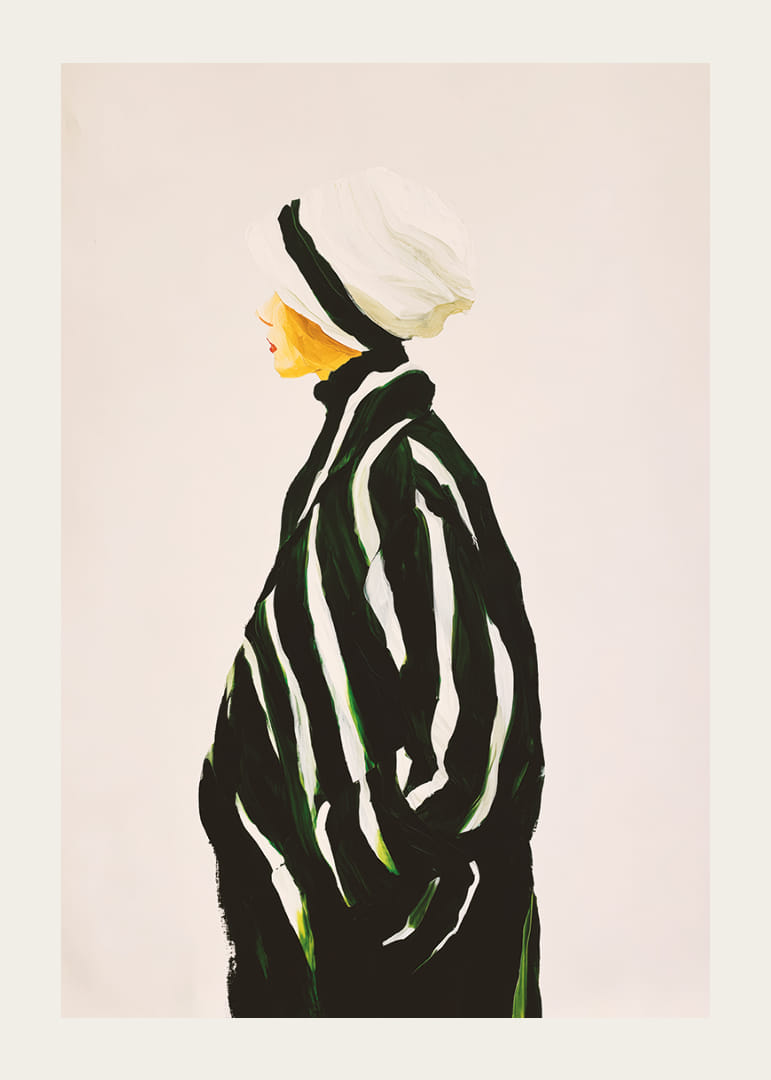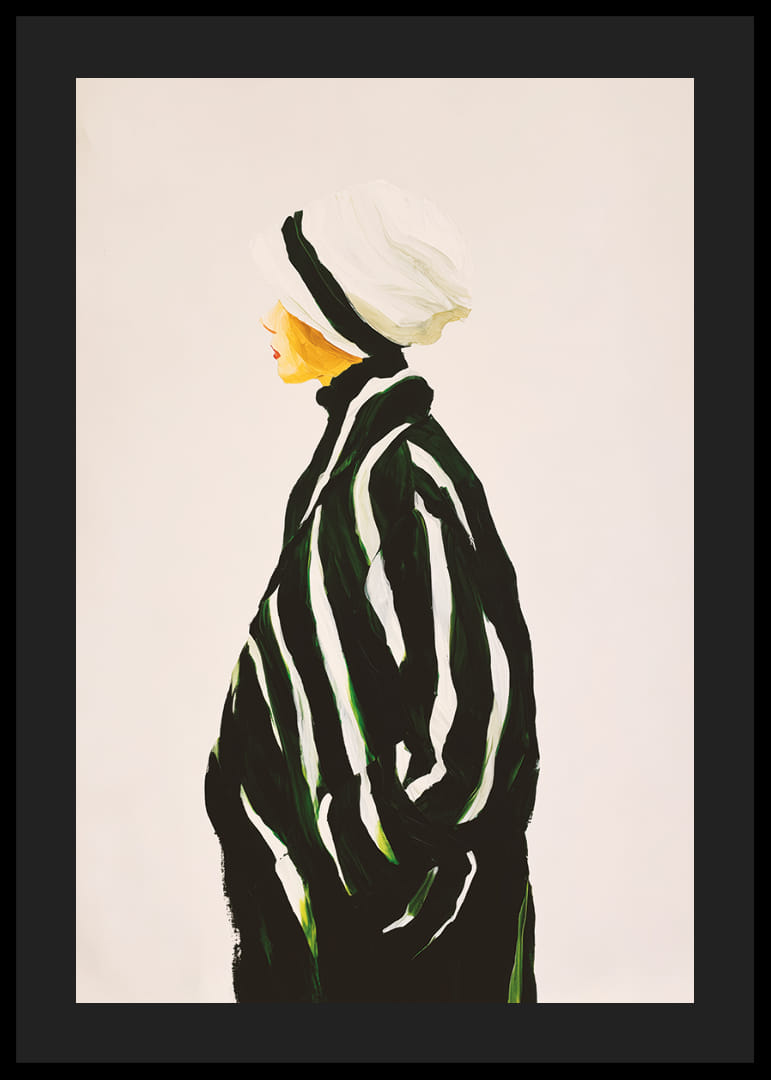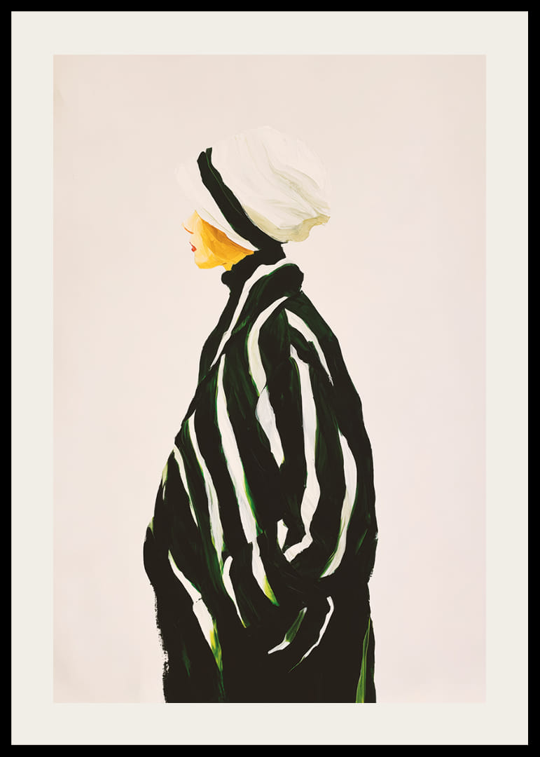 Denna poster fångar din uppmärksamhet med sina stilrena kontraster och eleganta design. De djärva svarta och vita ränderna mot en neutral bakgrund ger en tidlös känsla, medan den subtila silhuetten antyder elegans och sofistikering. Att hänga denna poster i ditt vardagsrum förvandlar rummet till en modern och inspirerande plats där enkelhet möter stil. Upplev konstens kraft i ditt hem.