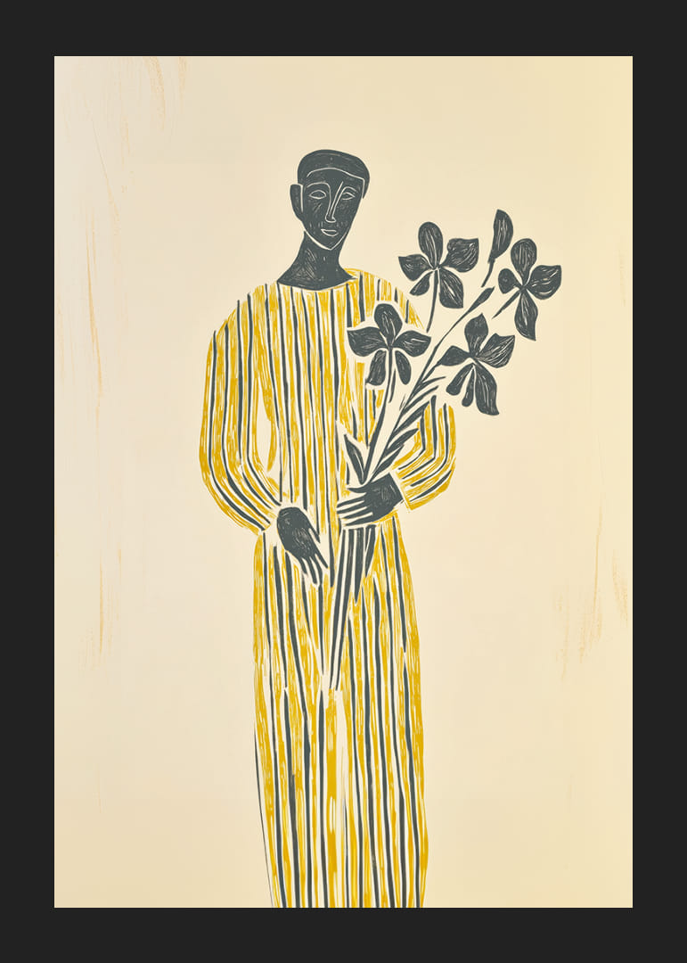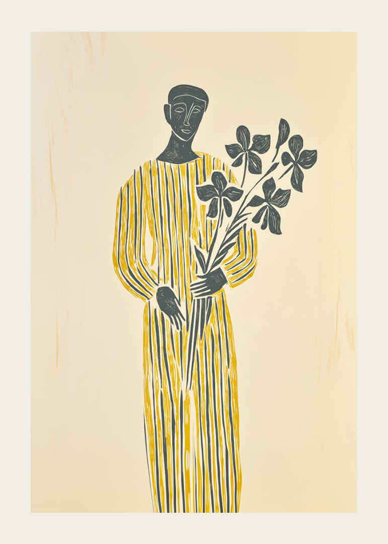 Postern fångar en mystisk figur klädd i en gulrandig dräkt som håller en ståtlig blomsterkvist. Den enkla men fängslande designen och de harmoniska färgerna skapar en känsla av lugn och stillhet. Figurer och linjer smälter samman på ett sätt som erbjuder både djup och lättsamhet, vilket ger ditt hem en elegant och drömsk atmosfär där postern blir en naturlig mittpunkt.