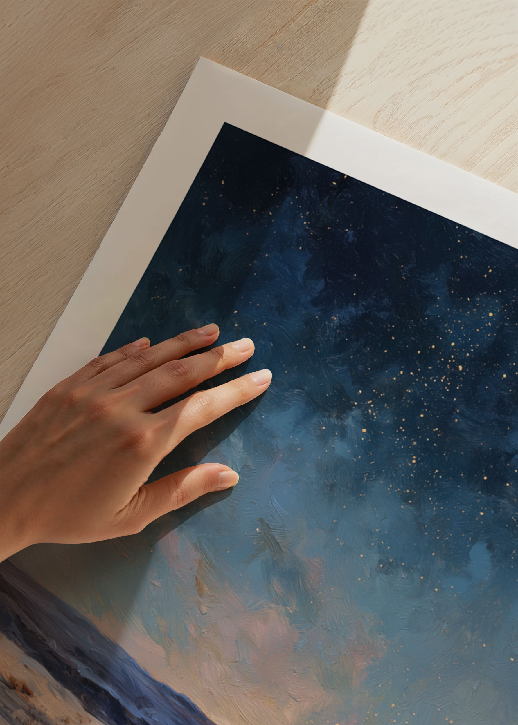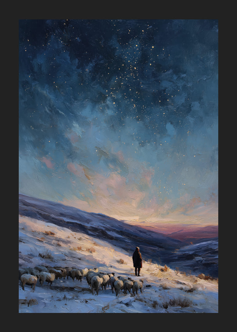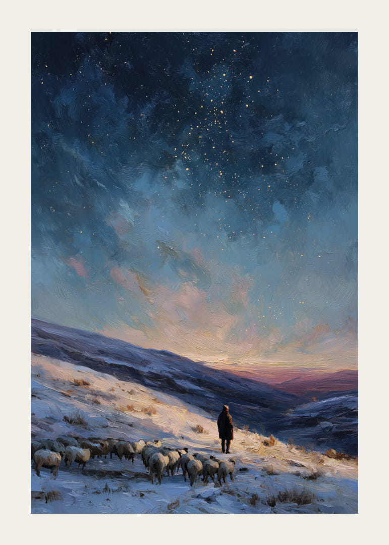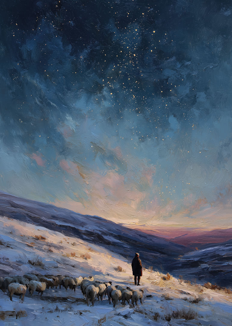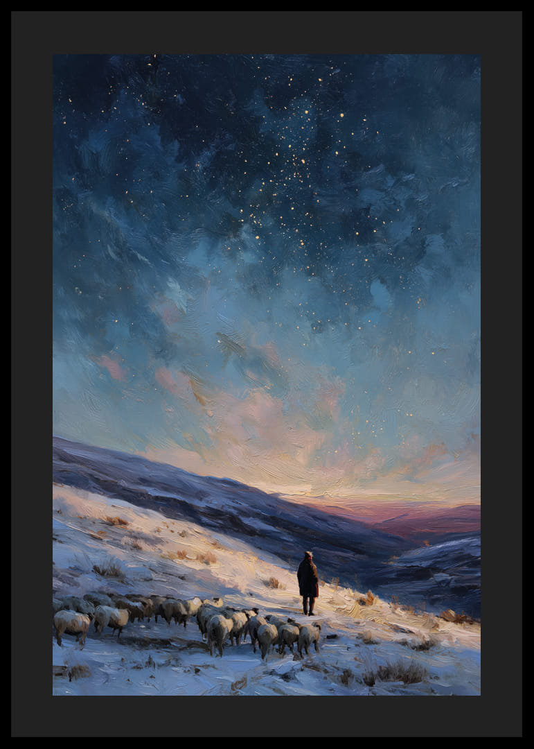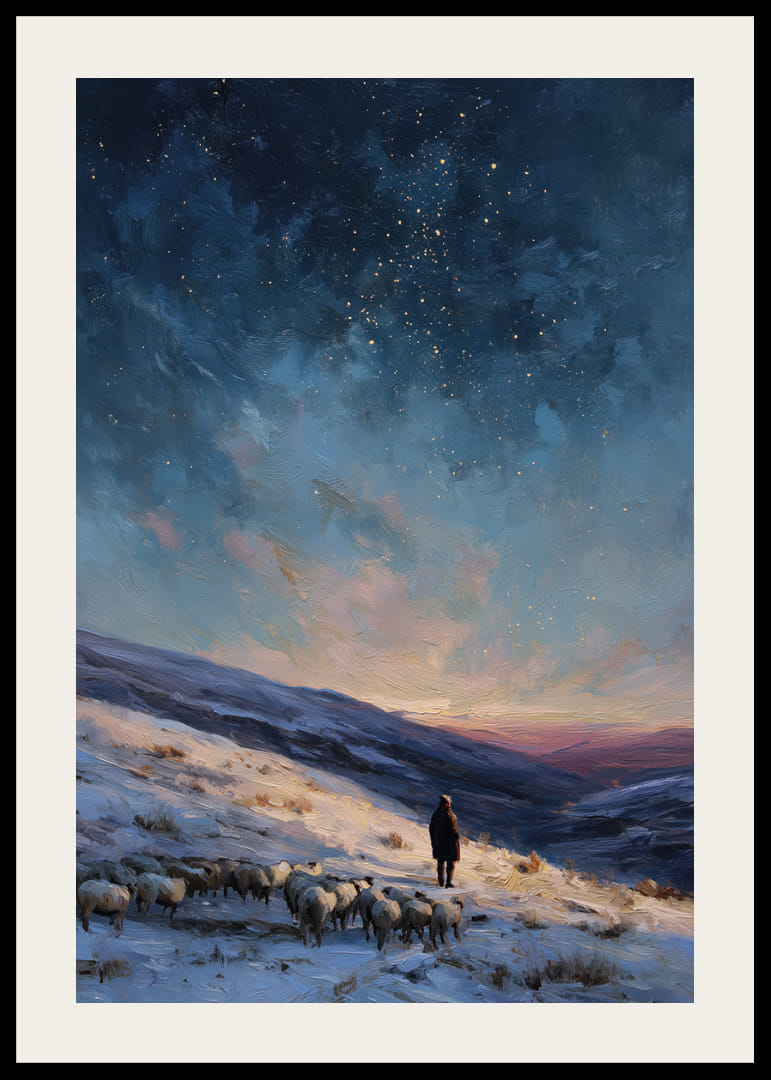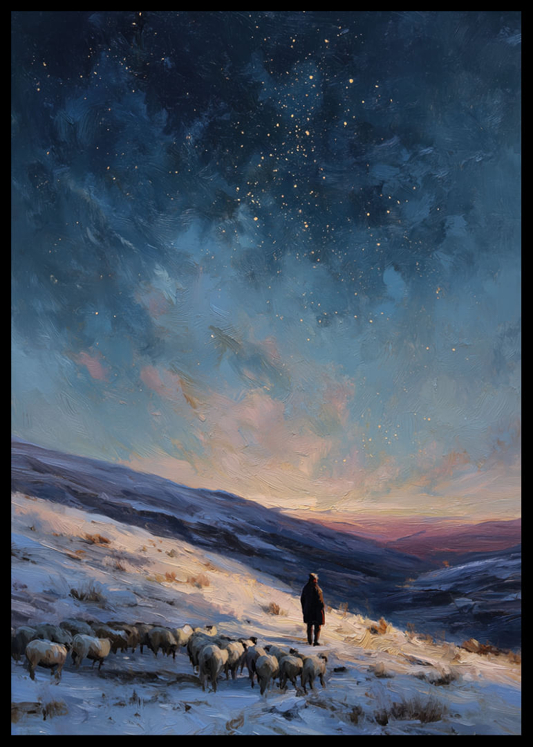 Under en gnistrande stjärnhimmel leder en ensam herde sina får genom det vinterklädda landskapet. Den djupa blå skyn möter ett stilla ljus vid horisonten, vilket skapar en känsla av lugn och frihet. Denna poster fångar ett magiskt ögonblick där naturen och människan förenas. Perfekt för att ge en känsla av ro och eftertanke i ditt hem.