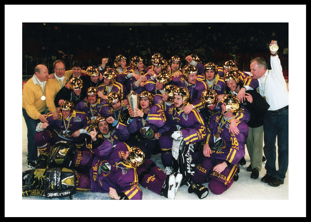 Laget för sig redo för gruppbild efter SM-guld 1998 i vinsten mot Djurgården i Sudden Death i den femte avgörande matchen.