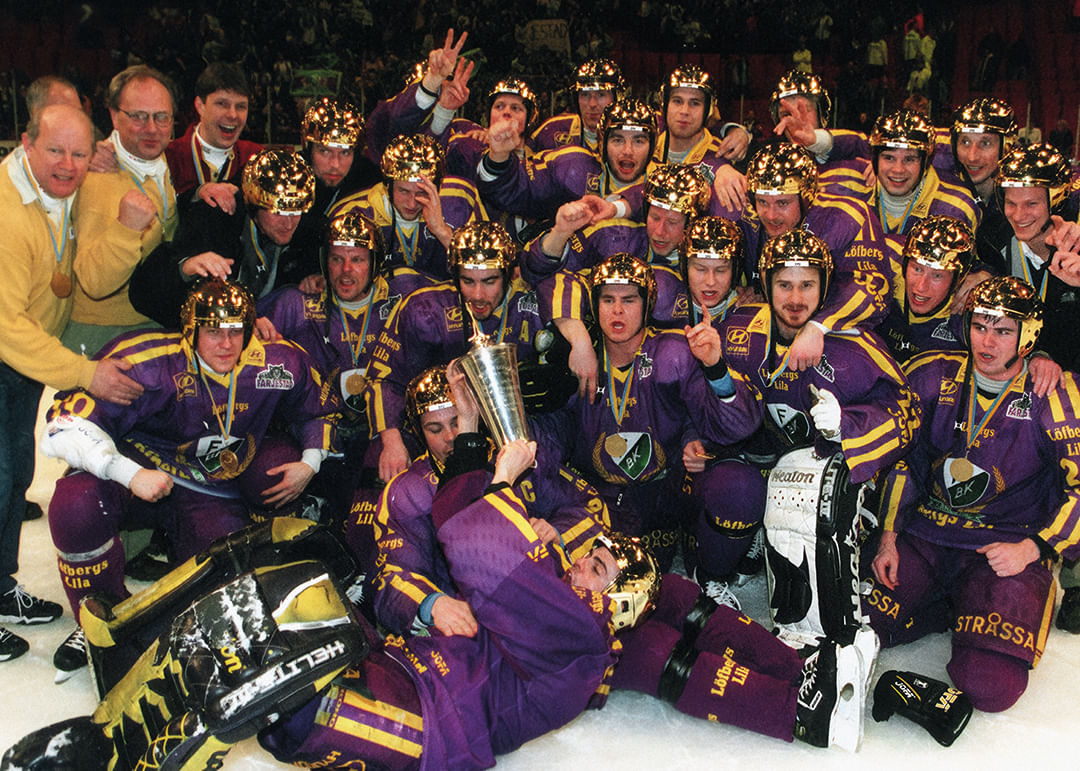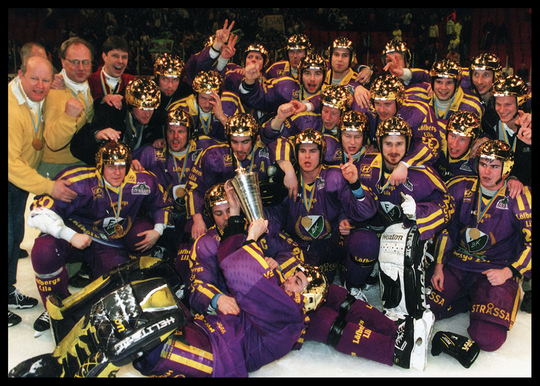 Laget för sig redo för gruppbild efter SM-guld 1998 i vinsten mot Djurgården i Sudden Death i den femte avgörande matchen.
