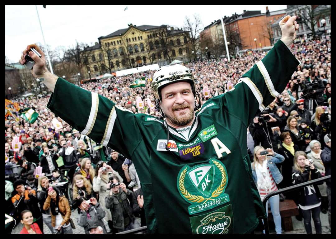 Jonas Frögren på Stora Torget i Karlstad när laget firar SM-guldet 2011 med staden.