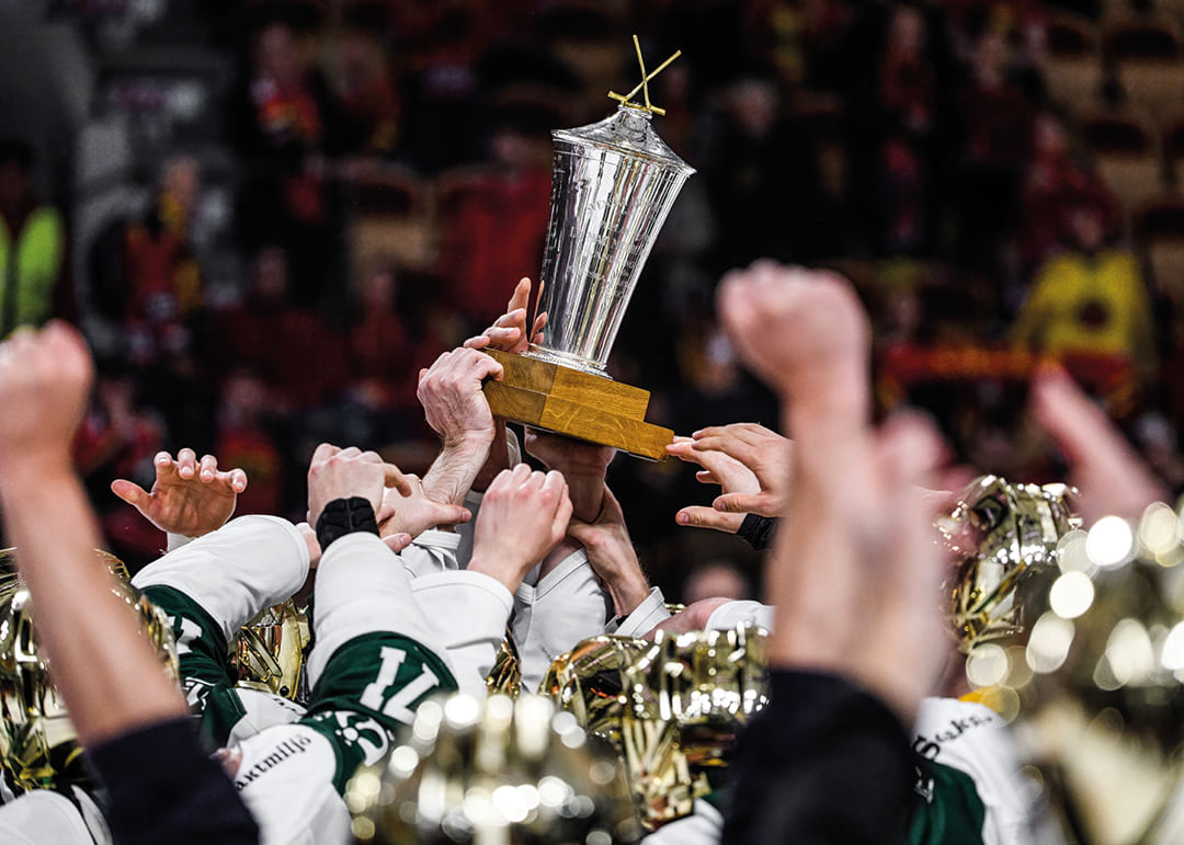 Färjestads spelare lyfter Le Mat-pokalen efter final sju i SHL mellan Luleå och Färjestad den 12 maj 2022 i Luleå.
