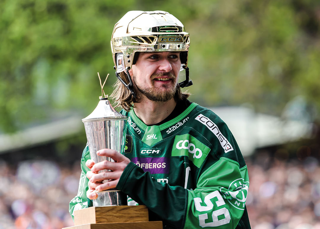 Färjestads Linus Johansson med Le Mat-pokalen under guldfirandet för Färjestad den 13 maj 2022 i Karlstad.