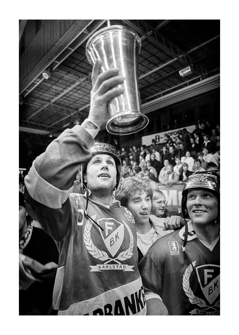 Kent-Erik Andersson håller upp Le Mat-pokalen för sina lagkamrater efter att Färjestad besegrat Södertälje i finalen 1986.