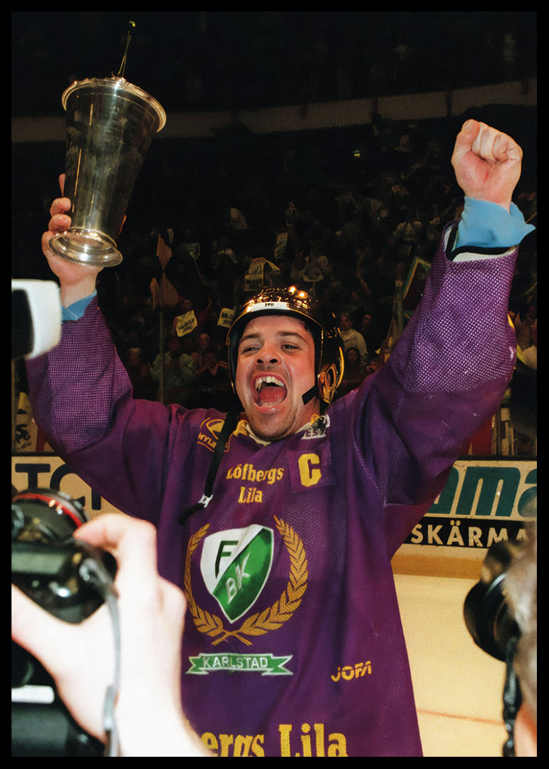 Färjestads Clas Eriksson jublar med Le Mat-pokalen efter vinsten över Djurgården i finalen 1998.