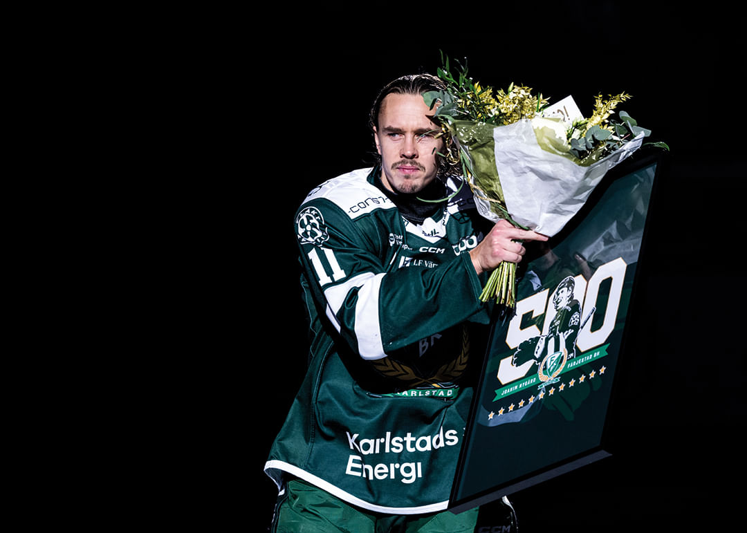 Färjestads Joakim Nygård hyllas för 500 SHL-matcher i Färjestad inför ishockeymatchen i SHL mellan Färjestad och Malmö Redhawks den 17 oktober 2024 i Karlstad.