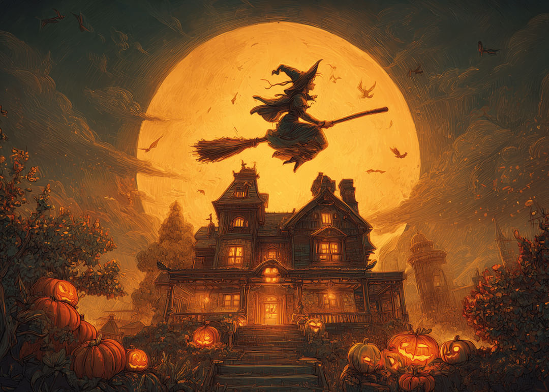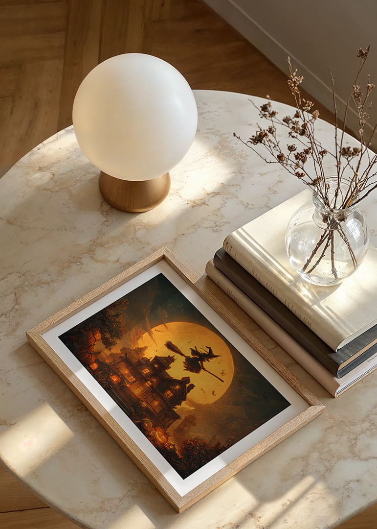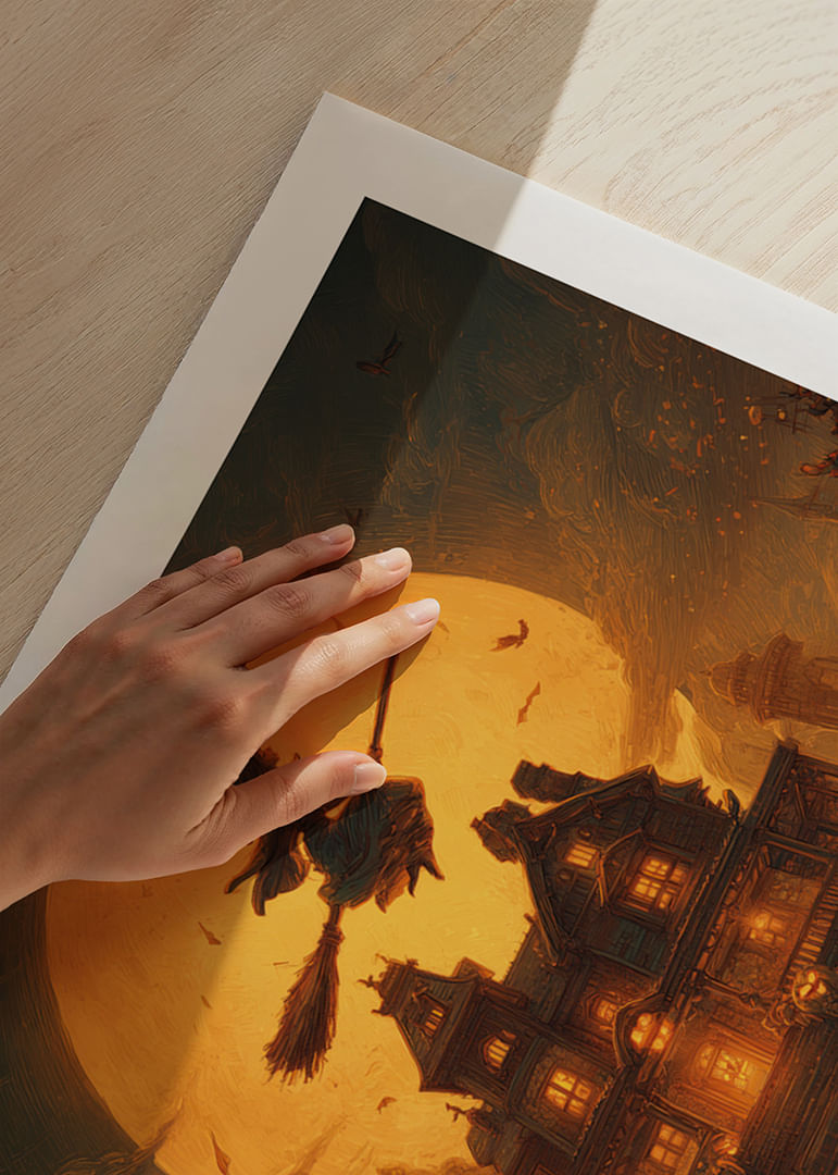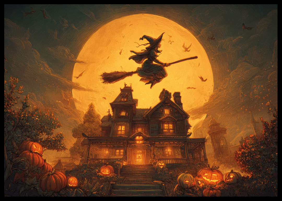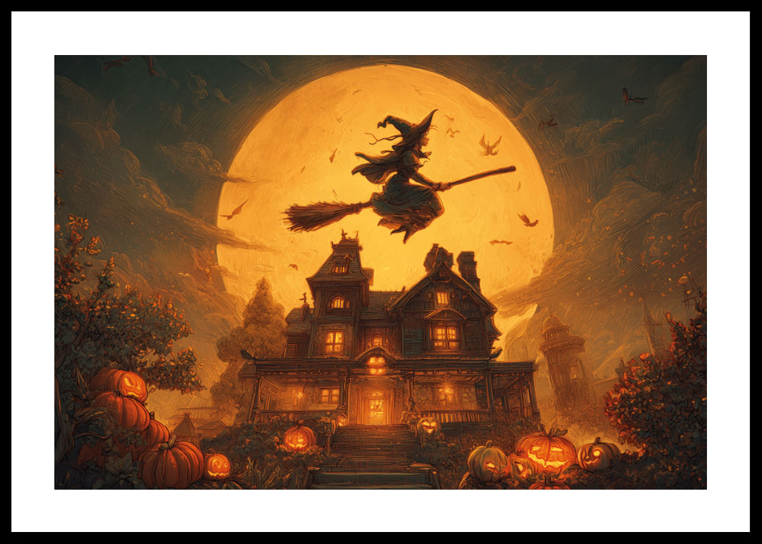 I den här postern sveper en häxa över ett nattligt landskap, belyst av en storslagen fullmåne. De flammande färgerna i pumpornas sken och den mystiska stämningen skapar en förtrollande känsla av Halloween. Den detaljerade illustrationen fångar rummets atmosfär och ger en fantasifull touch till alla utrymmen, vilket gör denna poster till en perfekt dekoration för den som älskar magins värld.
