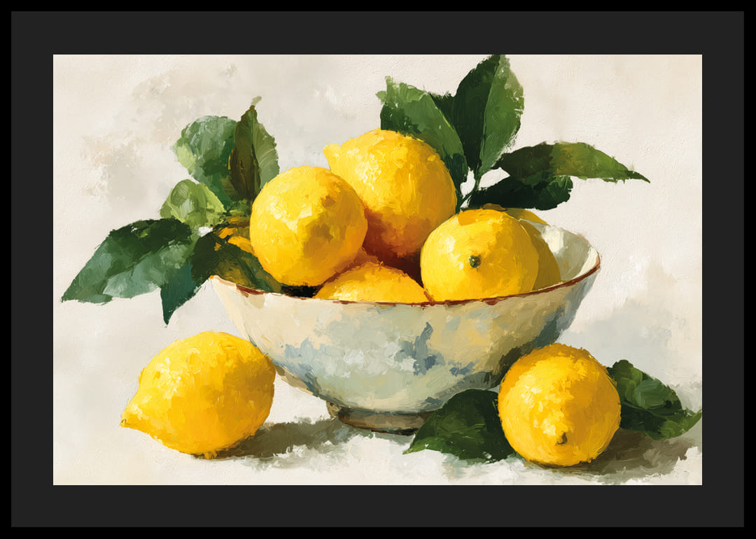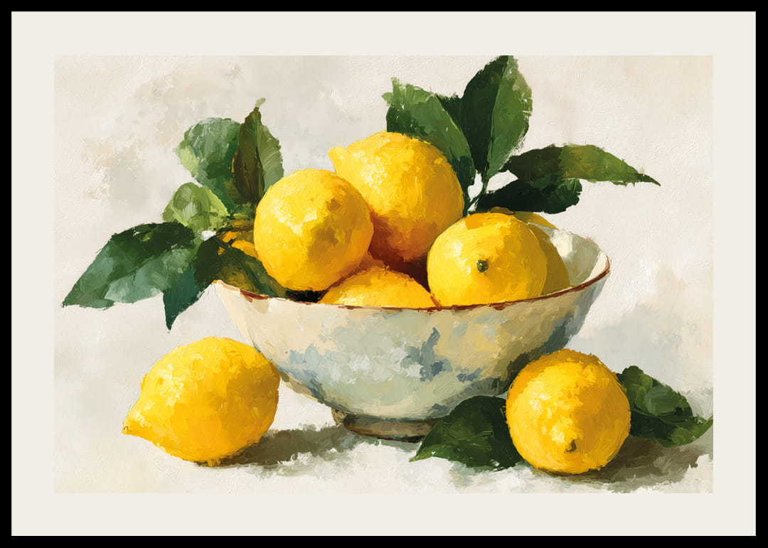 Denna poster fångar essensen av fräsch citrus med sina livliga gula citroner mot en mjuk bakgrund. De rika gröna bladen ger en naturlig kontrast som förstärker kompositionens harmoniska balans. Perfekt för att fräscha upp alla utrymmen, lägger postern till en känsla av livfull enkelhet och evig sommar. En utsökt detalj för kök eller matsal.
