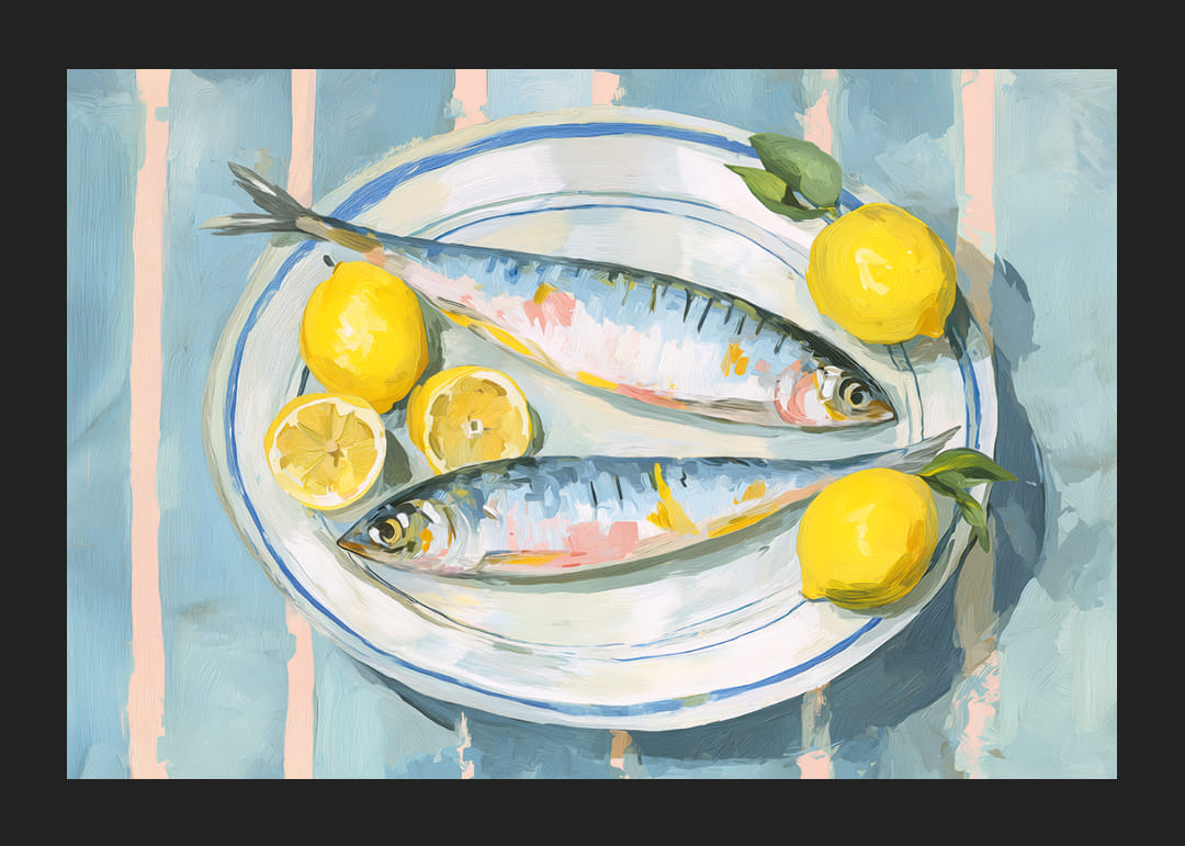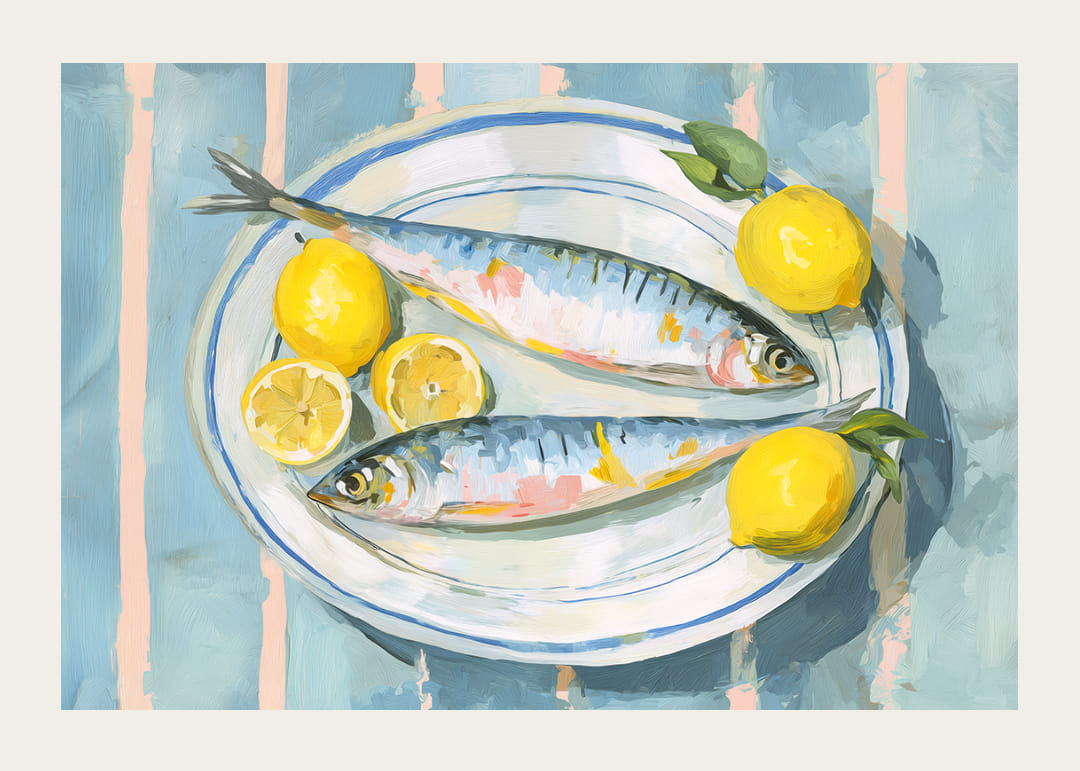 Denna poster fångar ett livfullt stilleben där färska fiskar vilar bredvid klara, gula citroner, omgivna av en harmonisk blågrön bakgrund. Den noggrant detaljerade stilen förstärker de naturliga färgerna och ger en känsla av friskhet och energi. En perfekt poster som förstärker rummets atmosfär med sina uppfriskande och klara toner och ger en touch av elegans och livfullhet.