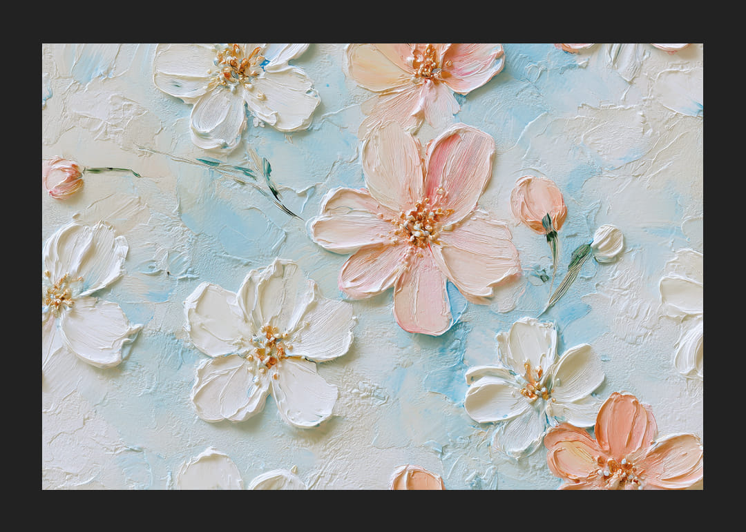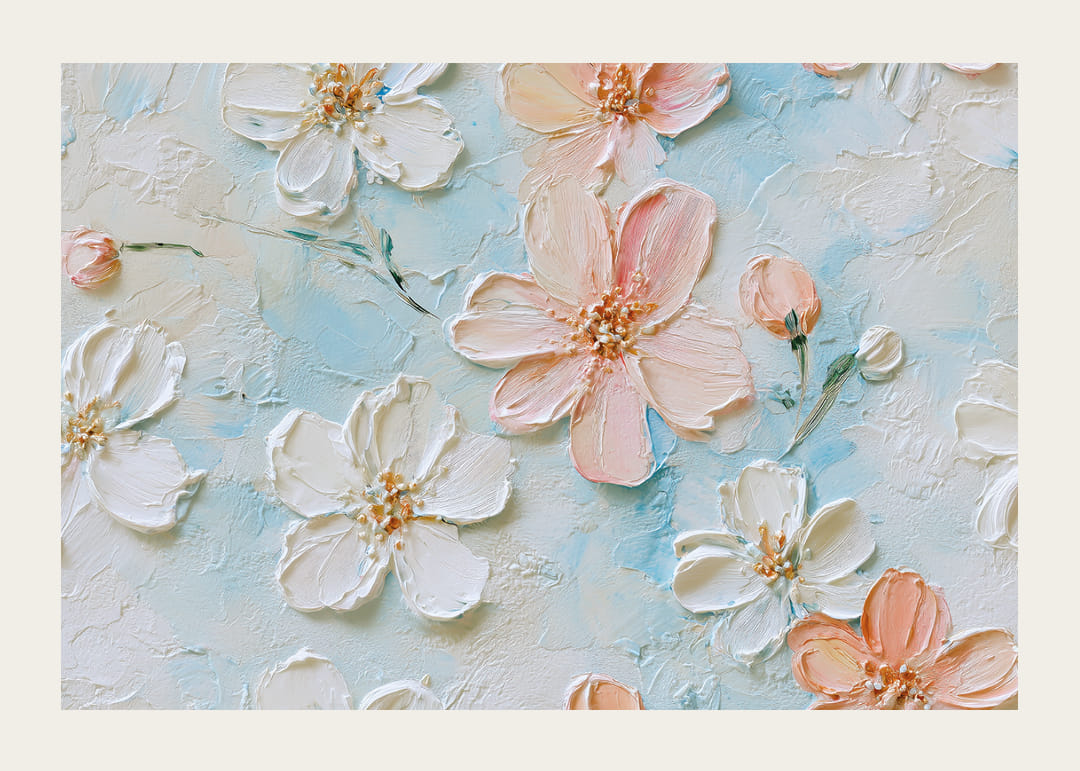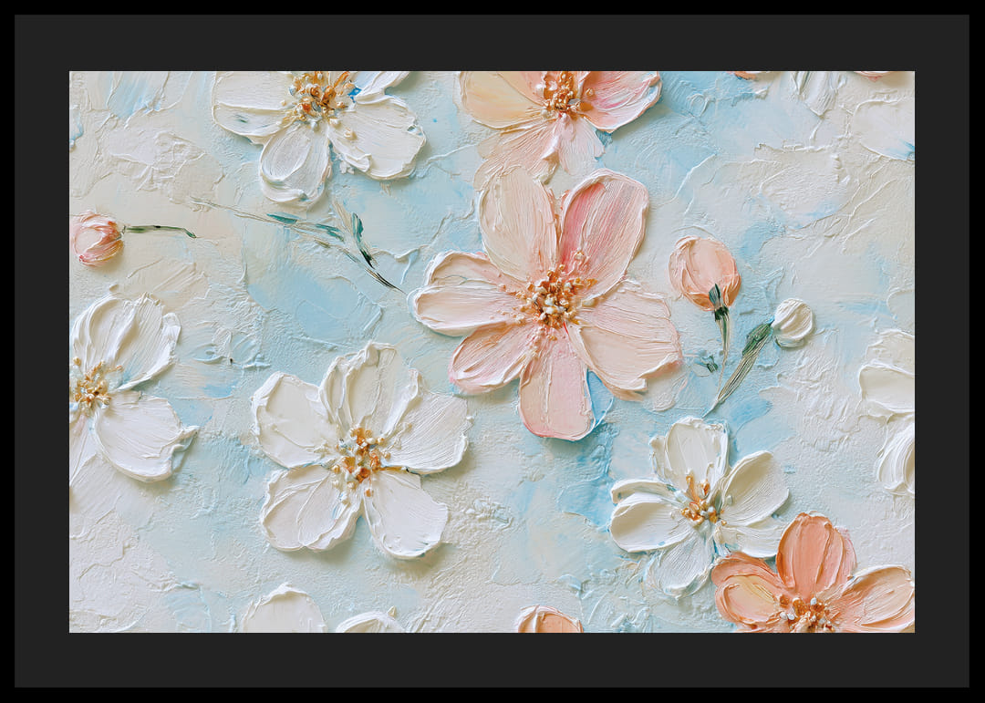 Denna poster fångar ögat direkt med sina delikata blommor som svävar mot en ljusblå bakgrund. Detaljerna i varje blomblad är noggrant målade och ger en känsla av stillhet och skönhet. Här blandas nyanser av rosa och vitt på ett harmoniskt sätt som skapar en drömlik atmosfär. Som väggdekor förvandlar denna poster vilket rum som helst till en lugnande tillflyktsort med sitt vackra och eleganta uttryck.