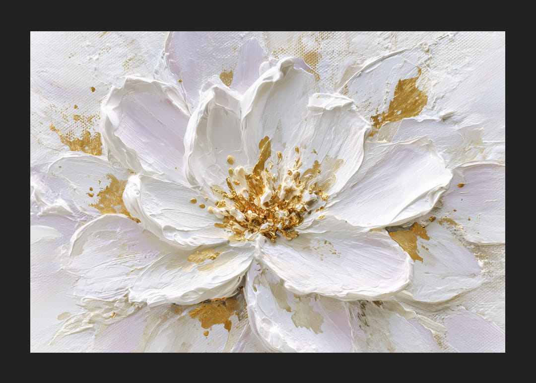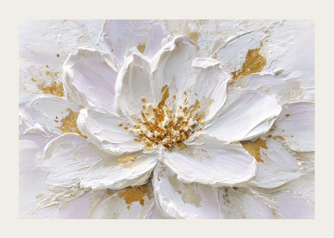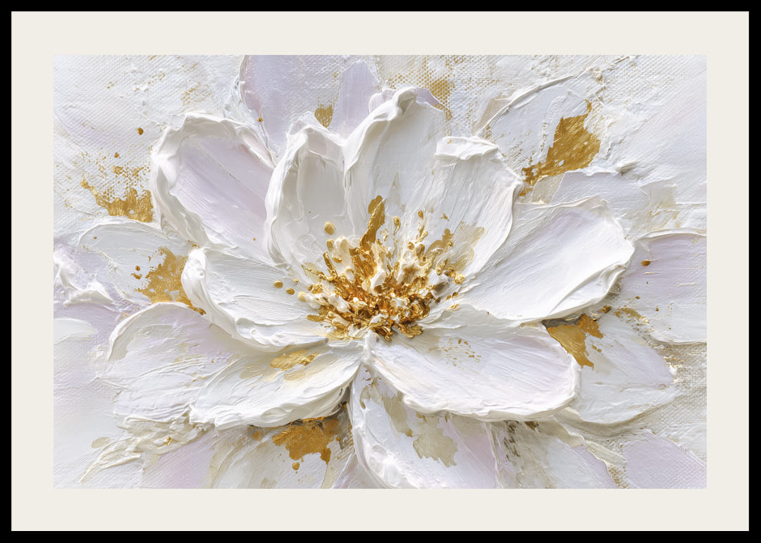 Denna poster fångar en fantastisk blomma i full prakt, där de guldfärgade detaljerna glimmar mot de mjuka, vita bladen. Den tredimensionella texturen ger en rik känsla av djup och liv. Perfekt för dem som vill ha en touch av elegans i sitt hem, skapar denna poster en varm och sofistikerad atmosfär som omvandlar vilket rum som helst till en fridfull reträtt.