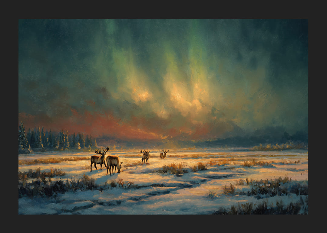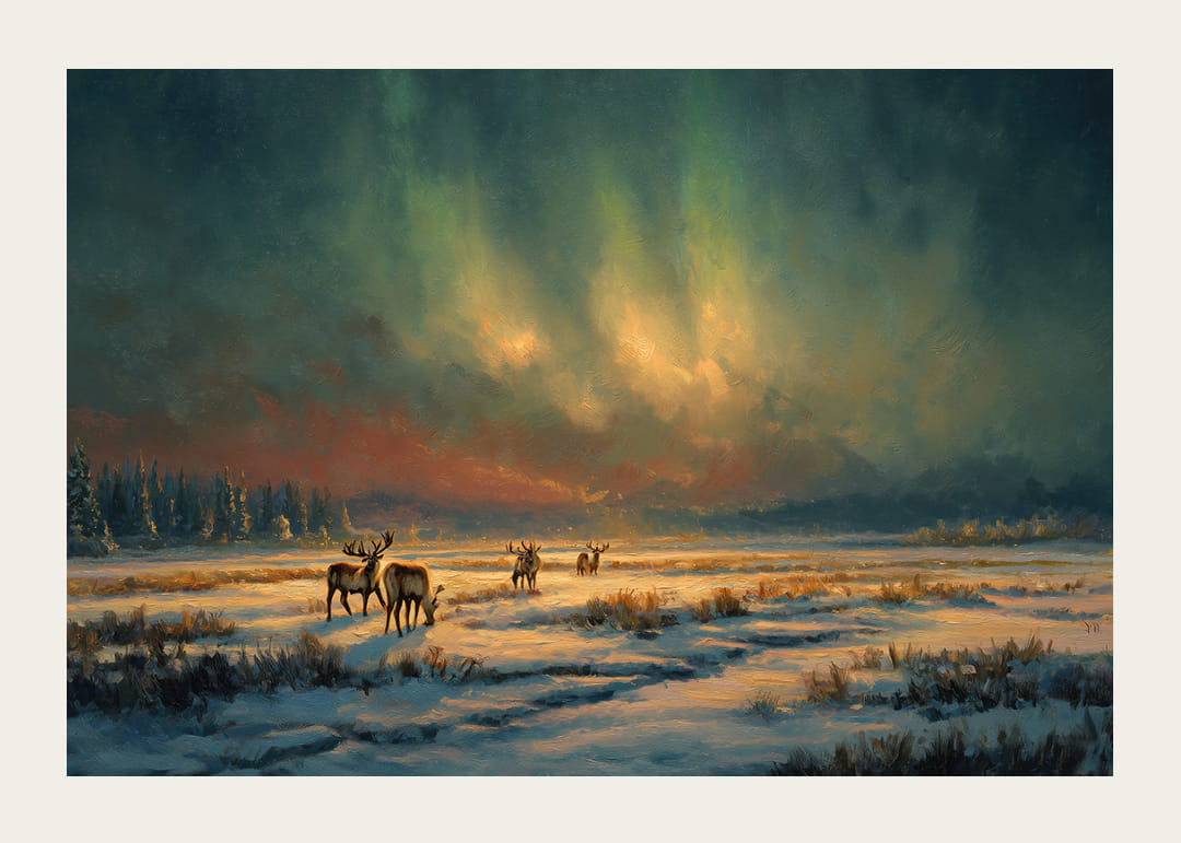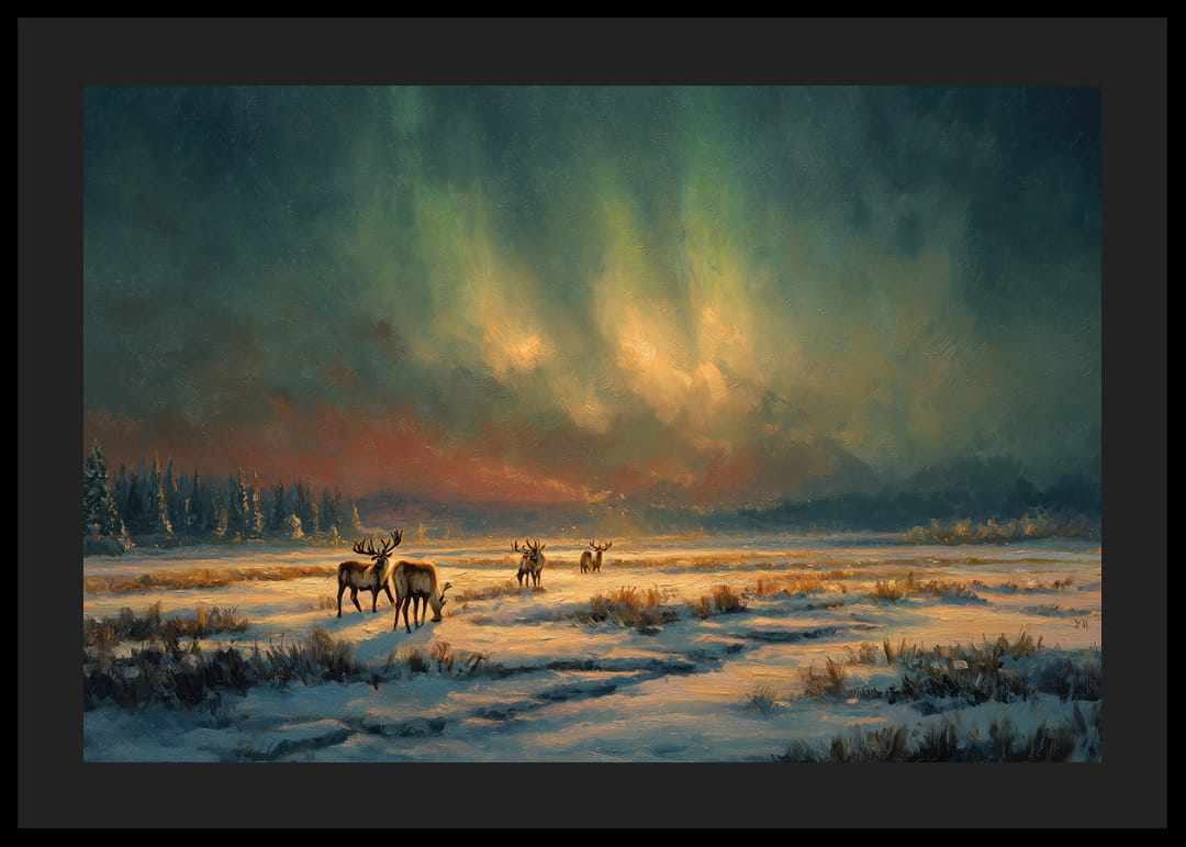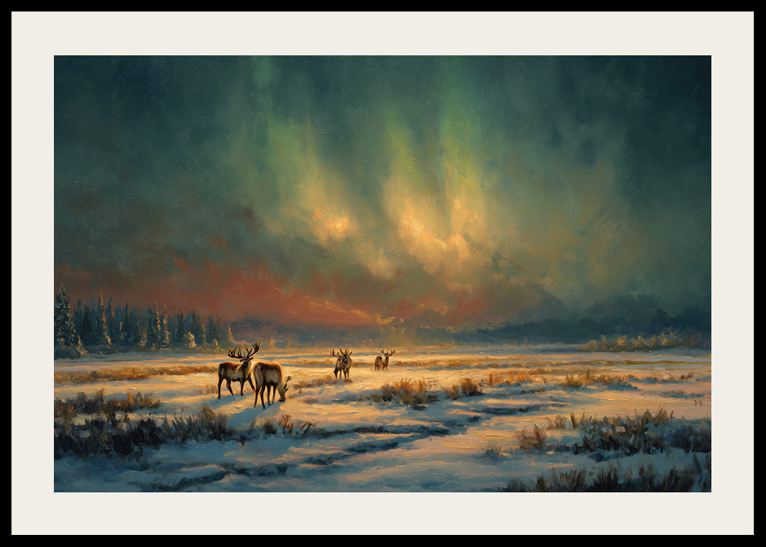 Fånga andan av den nordiska vildmarken med denna fascinerande poster som förenar norrskenets mystik med det fridfulla vinterlandskapet. De svala färgerna och den eleganta kompositionen skapar en rofylld känsla, där älgar vandrar fritt under himlens sken. Denna poster blir en harmonisk och uppseendeväckande dekoration, förvandlar ditt rum till en fridfull tillflyktsplats.