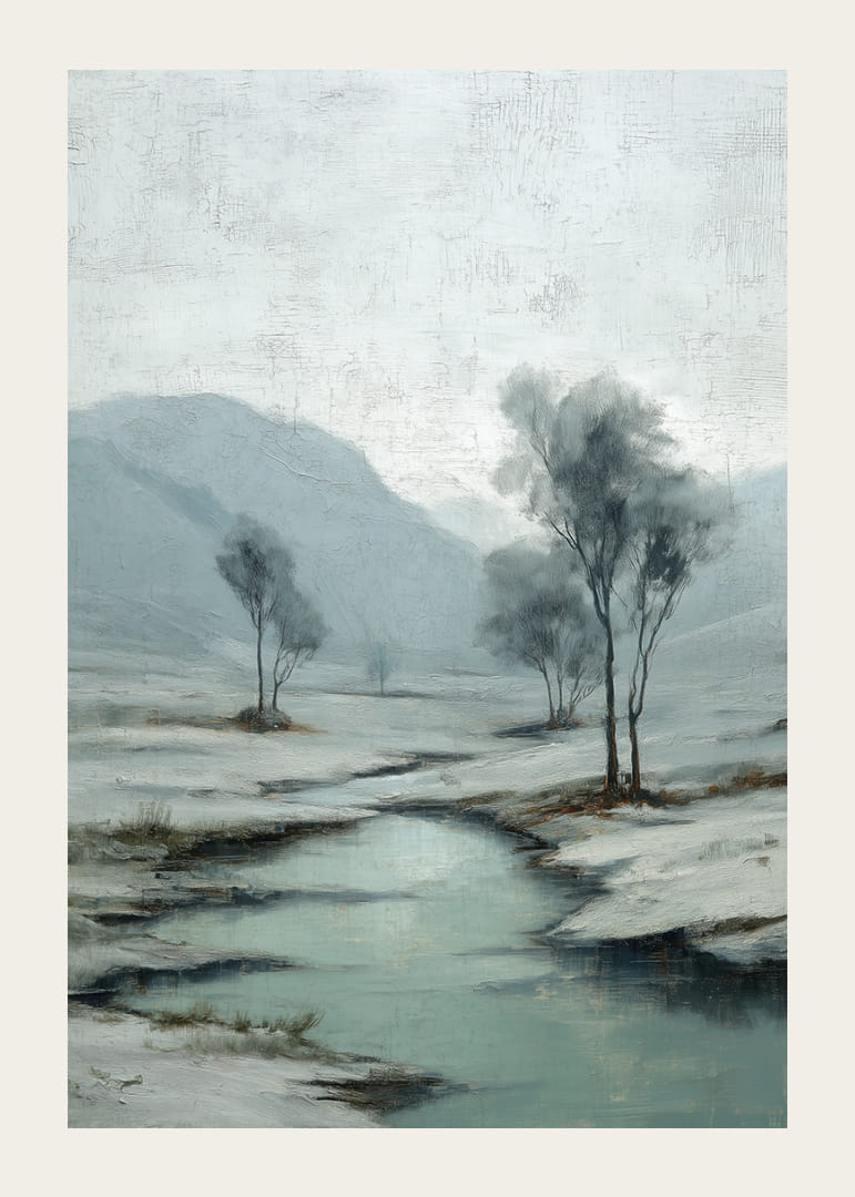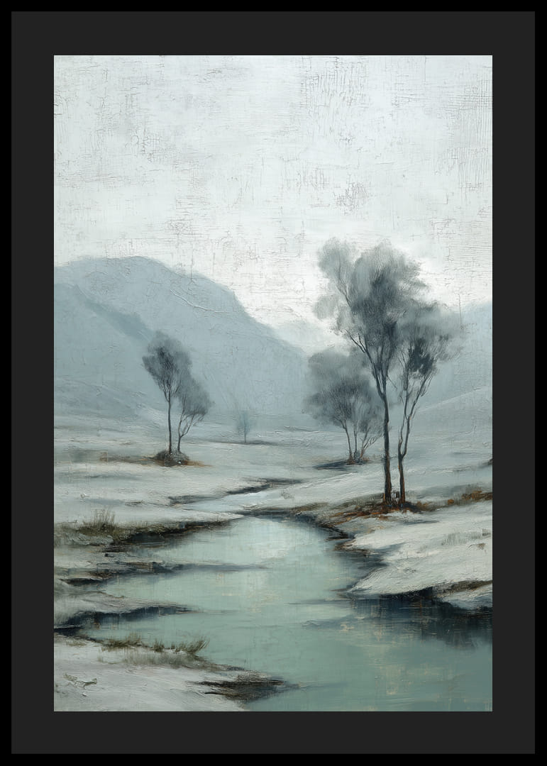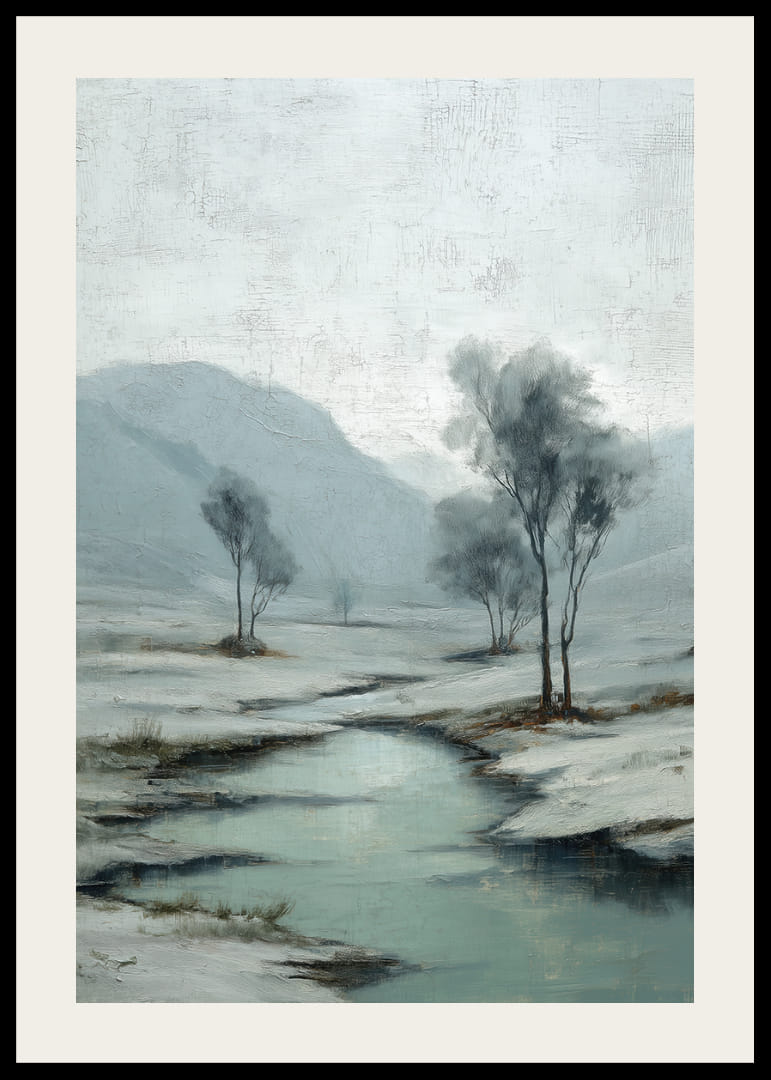 En vintrig poster fångar uppmärksamheten genom sitt lugna snölandskap där en kristallklar å slingrar sig fram. De mjuka, isiga färgerna och de stilla träden skapar en känsla av djup frid och tidlöshet. Kontrasten mellan den klara himlen och de dämpade tonerna förstärker motivets rogivande atmosfär. Denna poster förvandlar vilket rum som helst till en fristad av stillhet och harmoni.