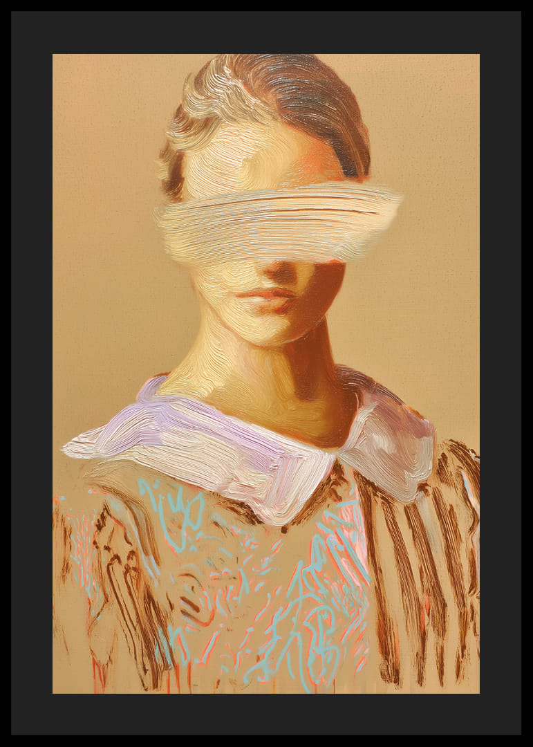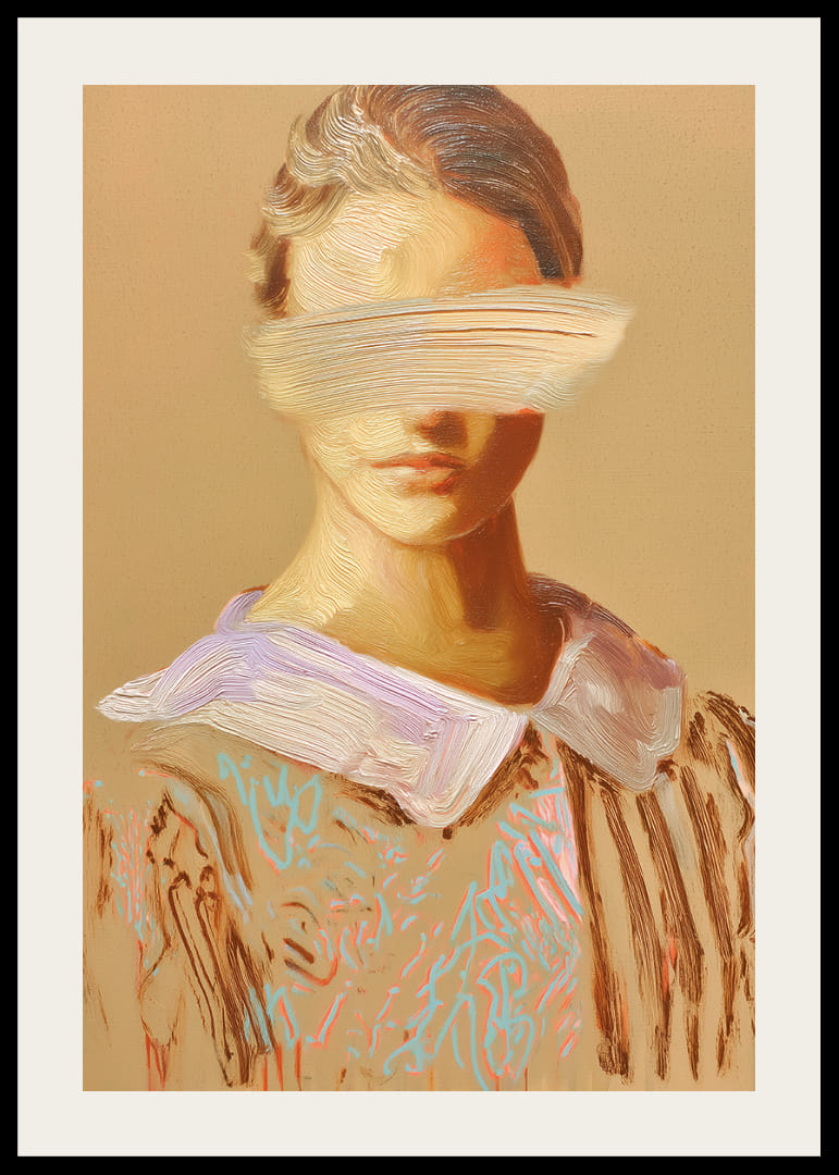 Denna poster fångar omedelbart betraktarens uppmärksamhet med sina mjuka penseldrag som skapar en mystisk och samtidigt lugn känsla. De dämpade färgerna ger bilden ett tidlöst uttryck, medan ansiktsdetaljerna delvis suddas ut, vilket väcker nyfikenhet och fantasi. Häng den på väggen för att ge ditt rum en touch av sofistikerad mystik och för att stimulera samtal och reflektion.