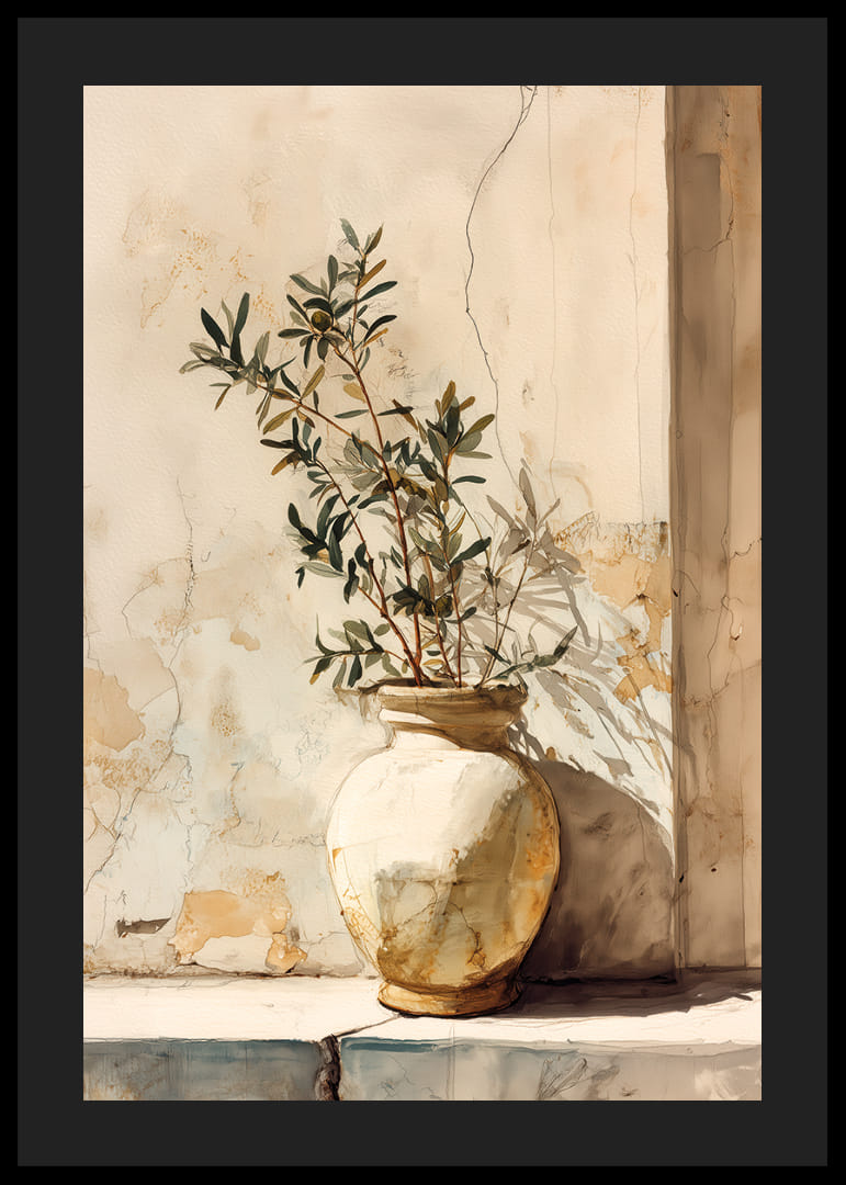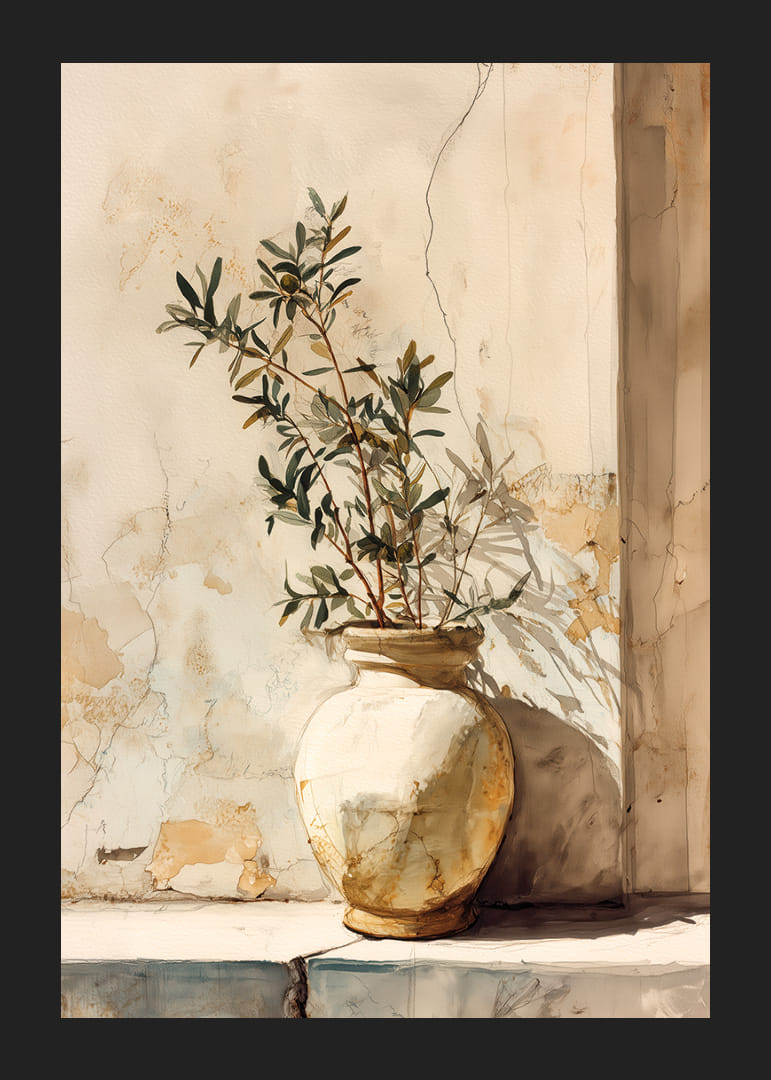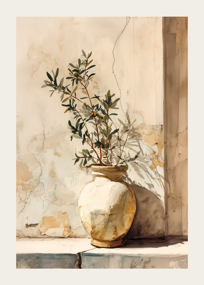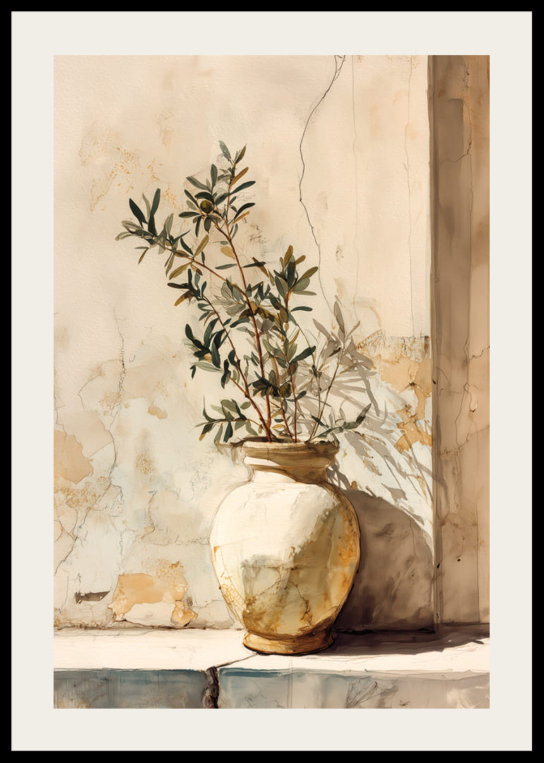 Denna poster fångar en solbelyst kruka som står mot en vägg med ljusa pastellfärger och åldrat gips, vilket ger en känsla av tidlöst lugn. De mjuka skuggorna och dova färgerna skapar en elegant och nostalgisk atmosfär. Posterns enkelhet och subtila nyanser gör den till en perfekt dekoration för att förvandla vilket rum som helst till en fridfull oas och tillföra en antydan av naturlig skönhet och charm.
