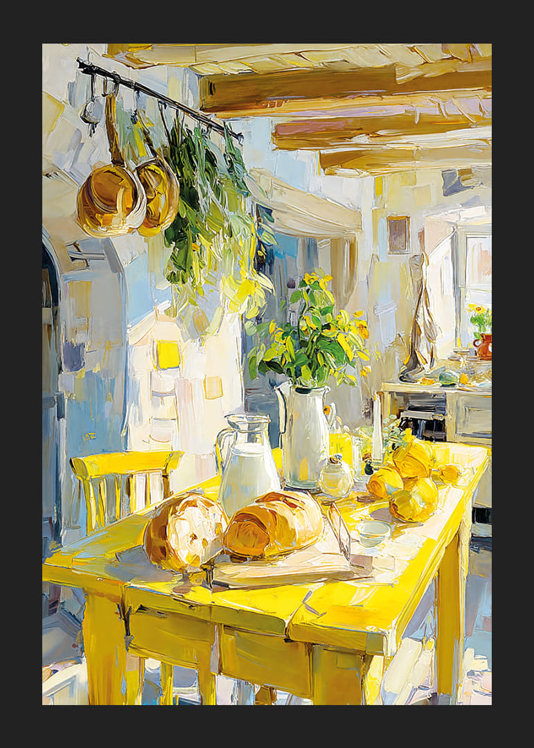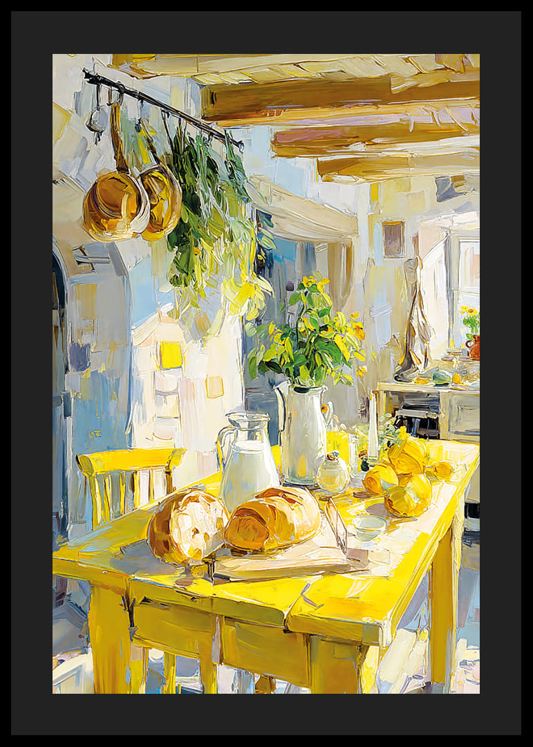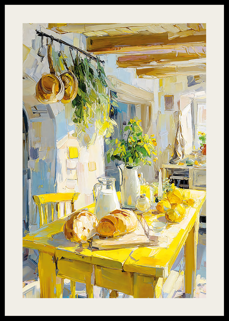 Denna poster fångar en idyllisk lantlig köksmiljö där solens gyllene strålar dansar över det rustika träbordet. Med färskt bröd, växter och en atmosfär av välkomnande värme, ingjuter den en känsla av frid och charm. Färgerna är ljusa och inbjudande, vilket gör denna poster perfekt för att förhöja stämningen i ditt vardagsrum eller kök och ger en smak av livet på landet.