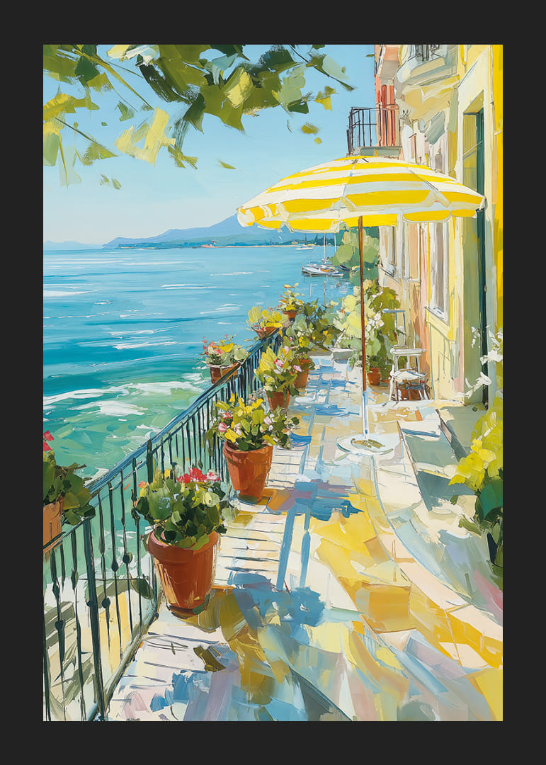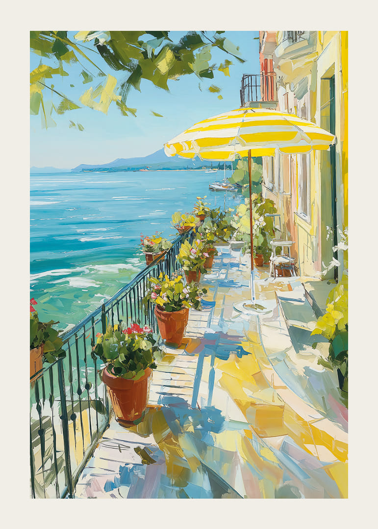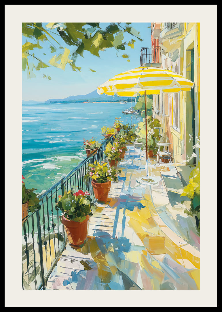 Denna poster fångar den soliga charmen av en medelhavsterrass mot ett kristallklart vatten. Ljusa nyanser av gult och grönt dansar över balkongen, inramade av blommor och ett randigt parasoll. Kontrasten mellan den klarblå himlen och det glittrande vattnet skapar en känsla av oändlig frihet. Postern tillför en lugnande atmosfär till vilket rum som helst och förvandlar det till en fridfull oas.
