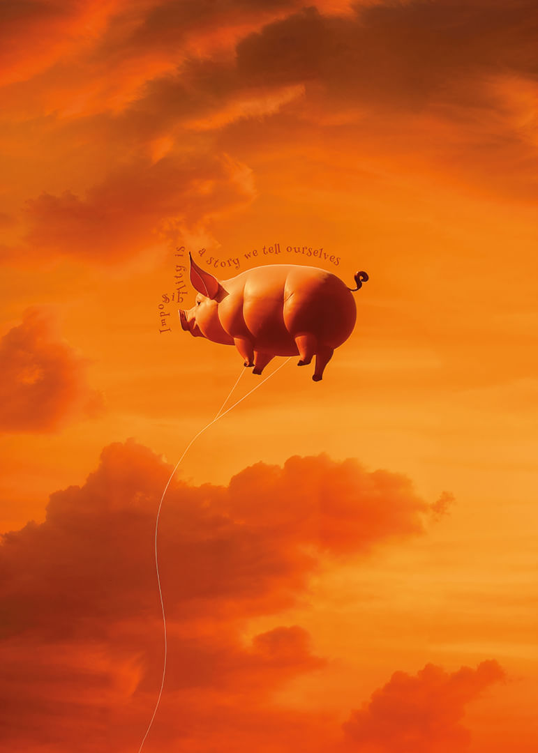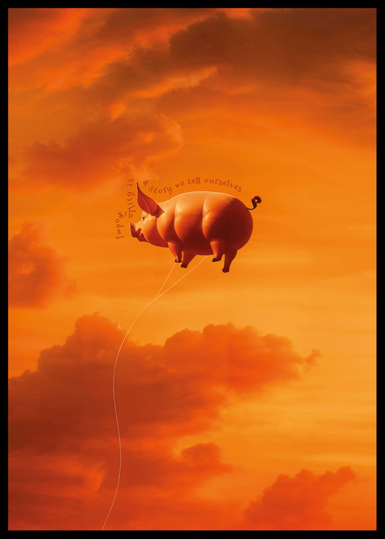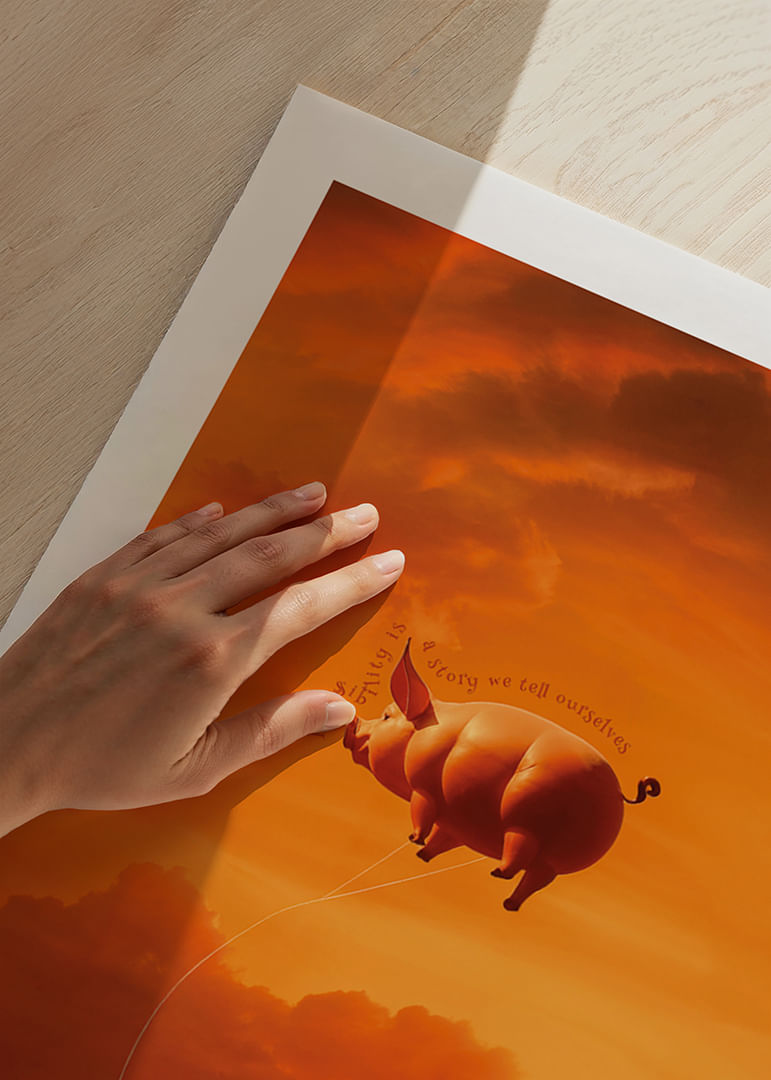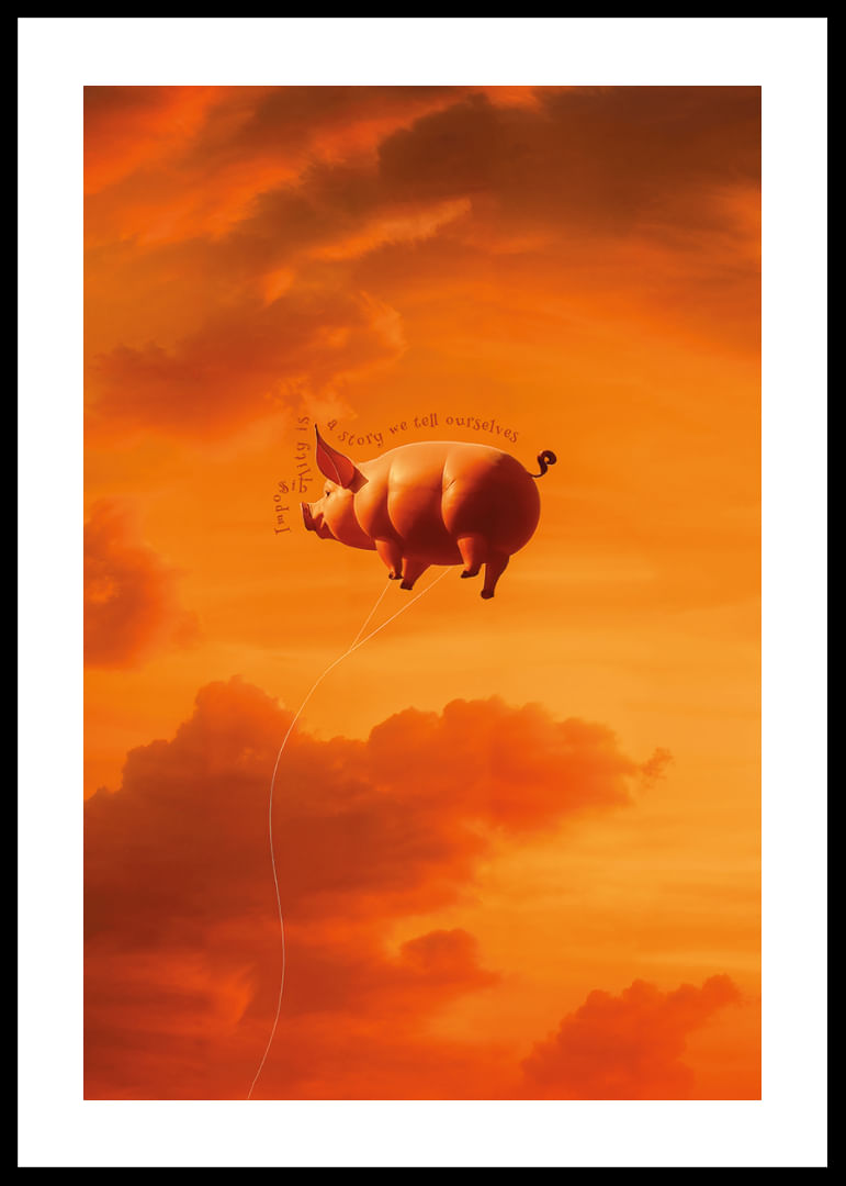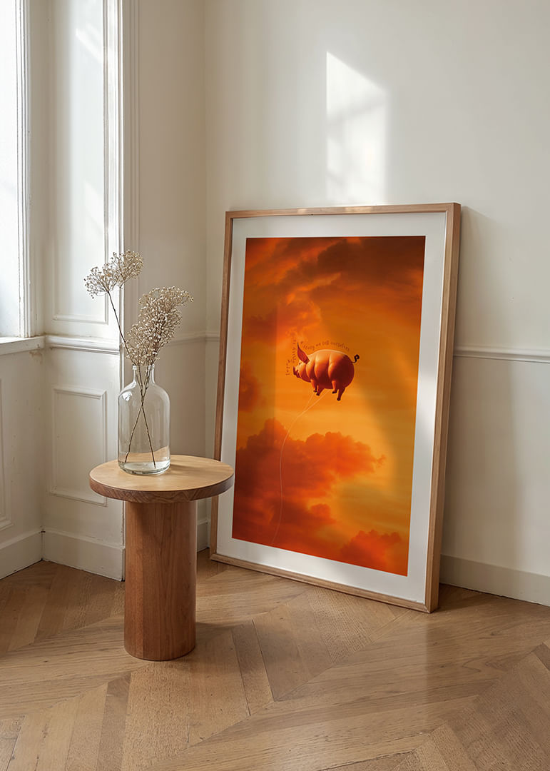 I denna stämningsfulla poster svävar en pigg liten gris högt upp i den eldiga kvällshimlen, omgiven av mjuka moln och gyllene ljus. Det drömlika landskapet bjuder in till fantasi och frihet, där himmel och jord tycks smälta samman. Med varje betraktelse erbjuder denna poster en känsla av upplyftande frihet och magi, och förvandlar vilket rum som helst till en portal till drömmarnas värld.
