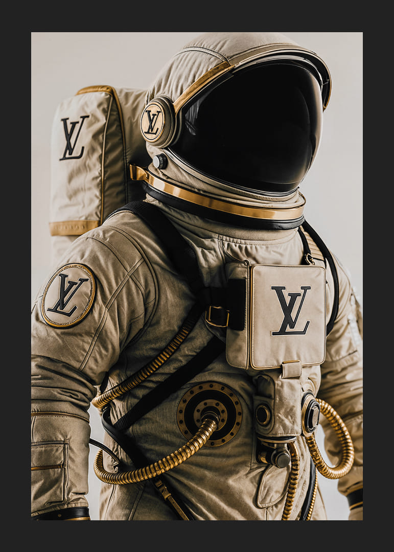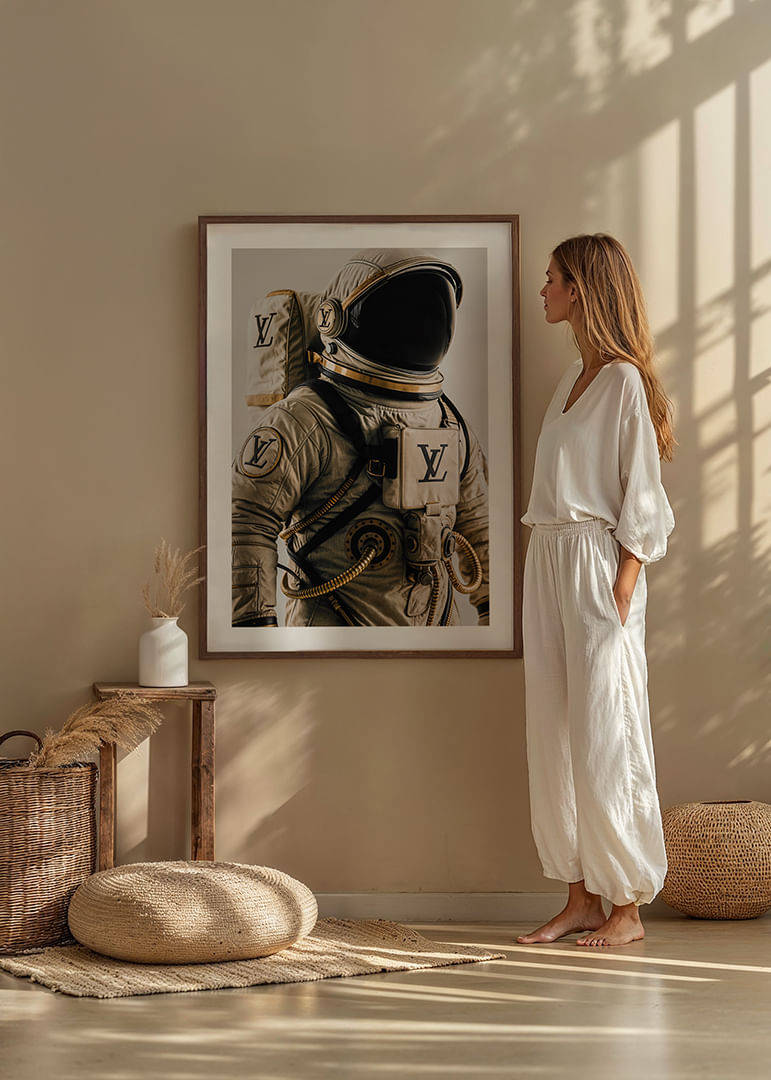Denna poster fångar ögat med en djärv fusion av rymdresor och högklassigt mode. Astronautdräktens stilfulla detaljer smälter samman med lyxens känsla, vilket skapar en atmosfär av futuristisk elegans. Perfekt för ett rum som behöver en touch av kreativitet och samtida sofistikering. Denna poster ger en känsla av oändliga möjligheter och inspirerar till drömmar bortom stjärnorna.