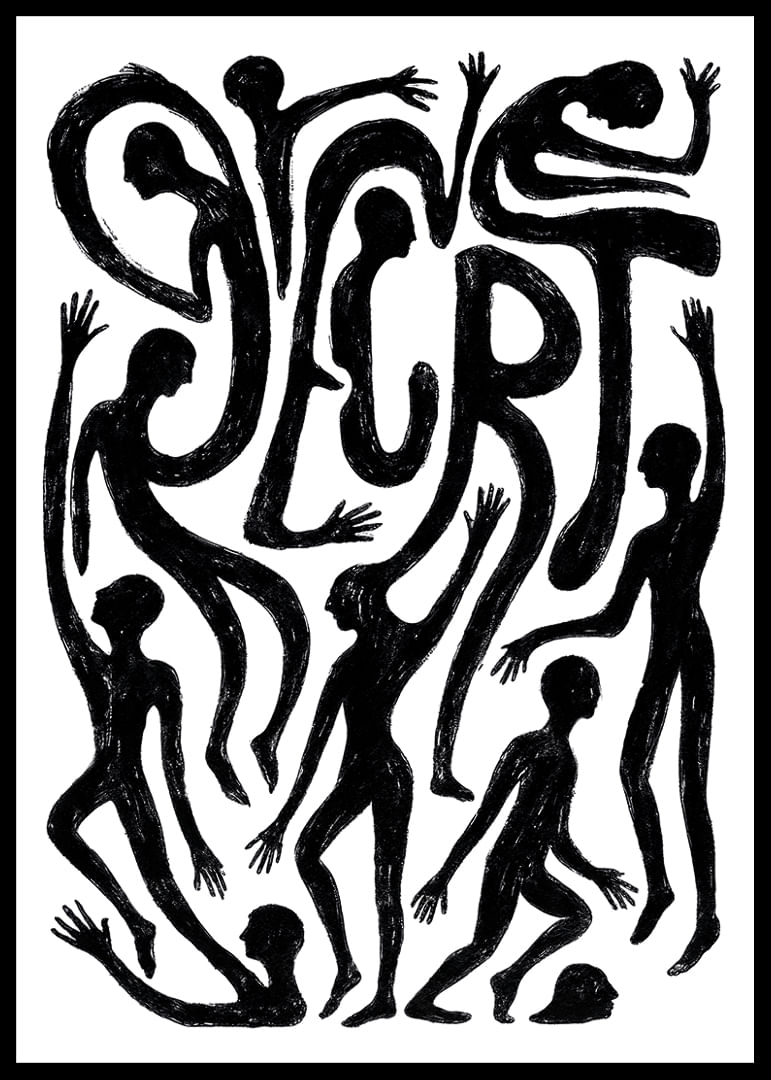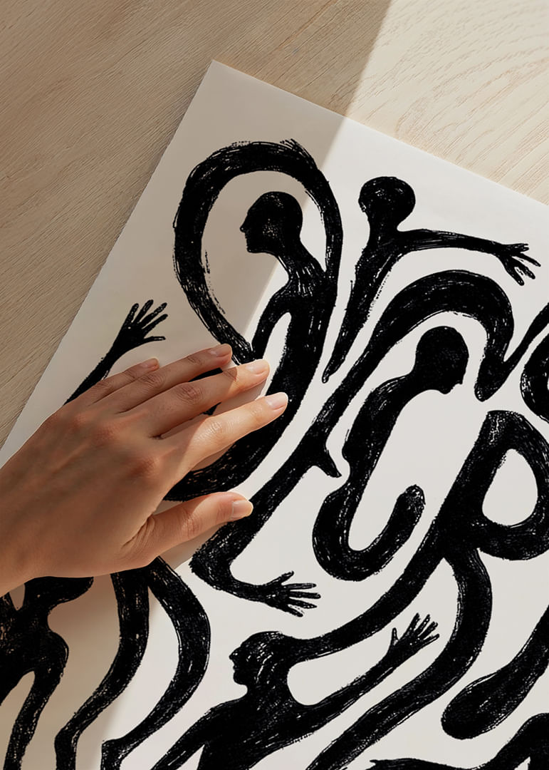 Denna poster fångar omedelbart uppmärksamheten med sina dynamiska och svepande silhuetter. Formen och rörelsen i de svarta figurerna ger en känsla av både energi och mystik. Postern väcker tankar och bjuder in till tolkning, medan de böljande linjerna och formerna bidrar med liv och rörelse. I vilket rum den än placeras, skapar postern en konstnärlig och inspirerande atmosfär som tar med sig fantasin till nya höjder.