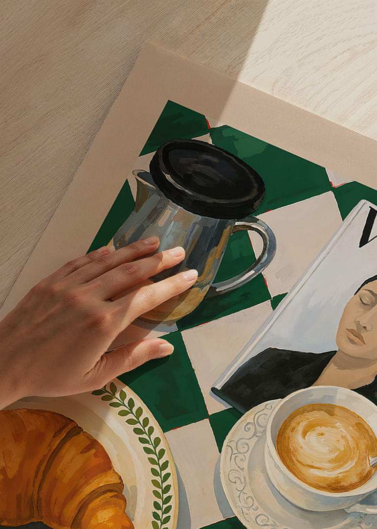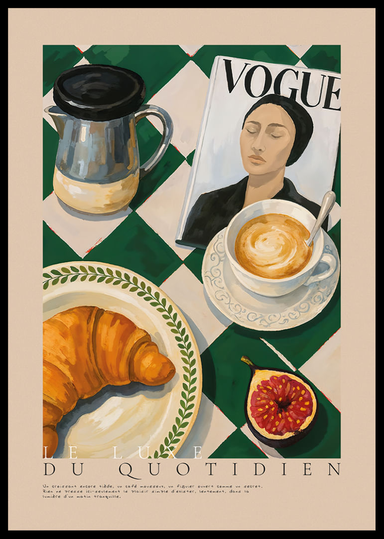 Denna poster fångar en fransk frukost med en känsla av elegant vardagslyx. Det mjuka ljuset över perfekta croissanter, en fyllig cappuccino och ett öppet magasin skapar en atmosfär av välbehag. Färgerna i grönt och brunbeige ger en sofistikerad charm. Postern är idealisk för att förvandla köket eller frukostrummet till en plats av god smak och stilfull avkoppling.