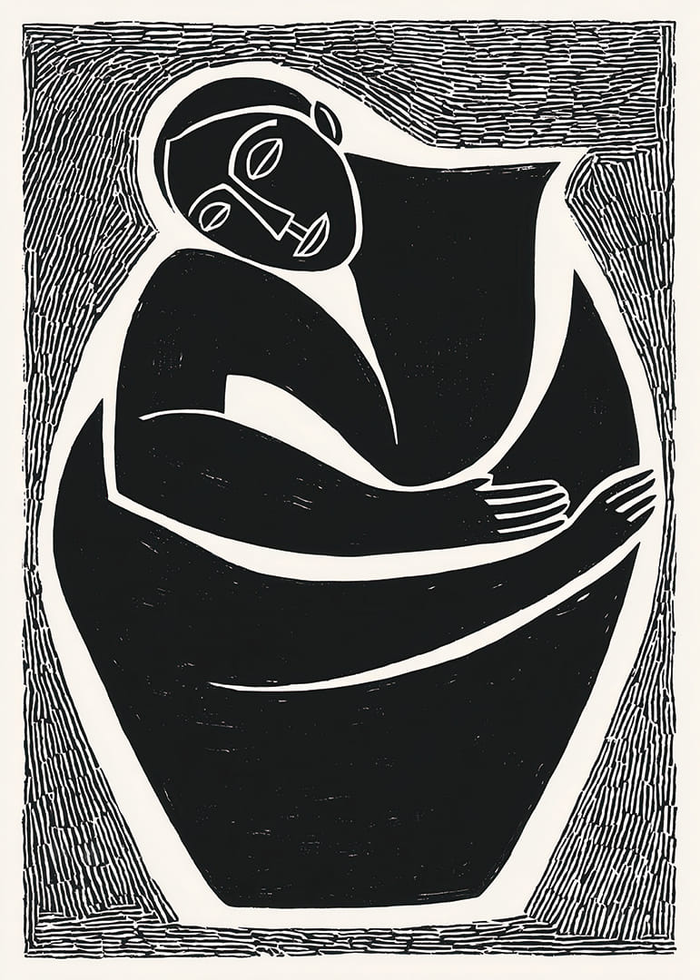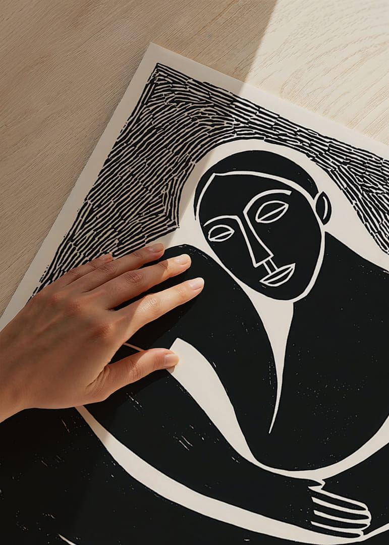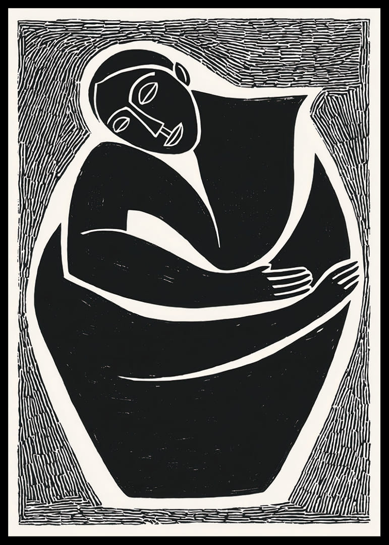 Med sina djärva, svarta linjer och harmoniska former erbjuder denna poster en stark visuell upplevelse, som fångar betraktarens uppmärksamhet med sin tysta introspektion. Kontrastens intensitet framhäver känslan av frid och ensamhet, vilket ger rummet en atmosfär av eftertänksamhet och lugn. Denna poster kan verkligen förändra och berika ett vardagsrum med sitt djupa uttryck