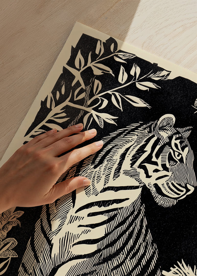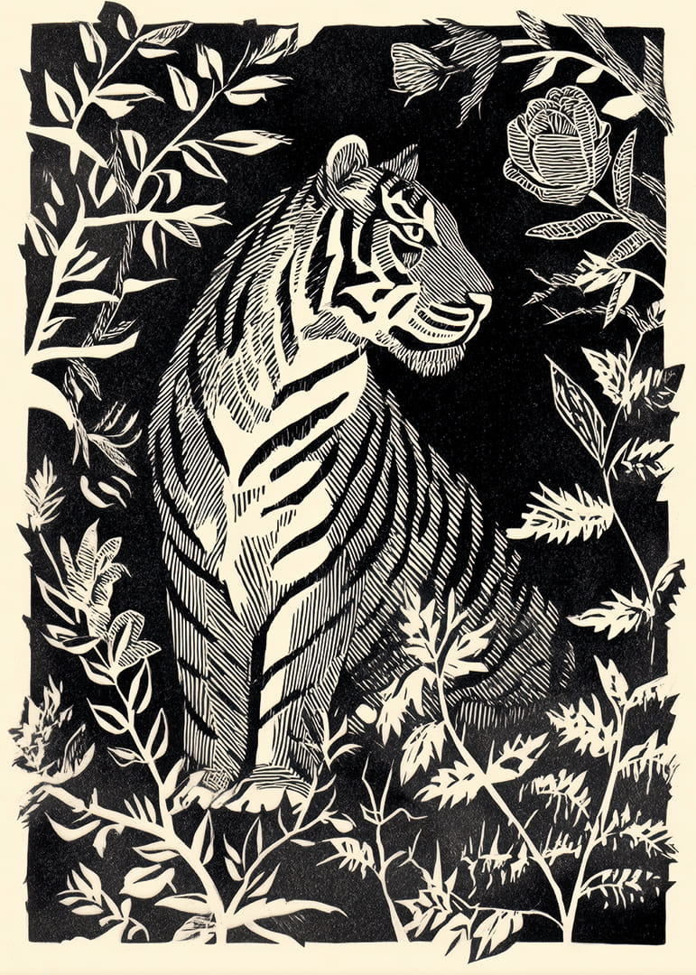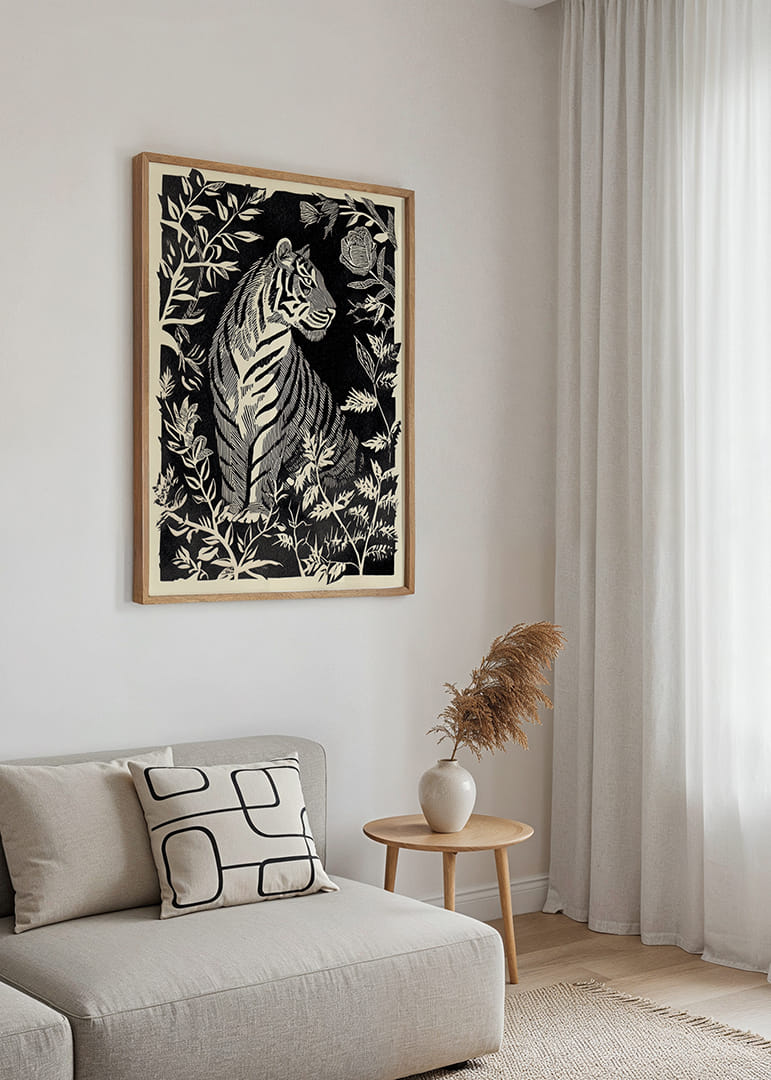 I denna förtrollande poster omfamnas betraktaren av en tigris graciösa närvaro, inramad av tät och mystisk växtlighet. Med djärva linjer och skuggspel fångas tigerns elegans mot en mörk bakgrund. Denna poster tillför en känsla av mystik och vild skönhet till vilket rum som helst, där den bjuder in till fantasifull fördjupning och en atmosfär av naturlig majestät