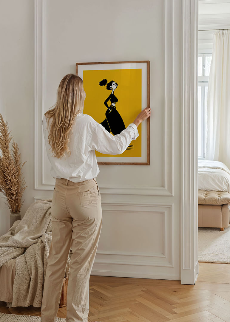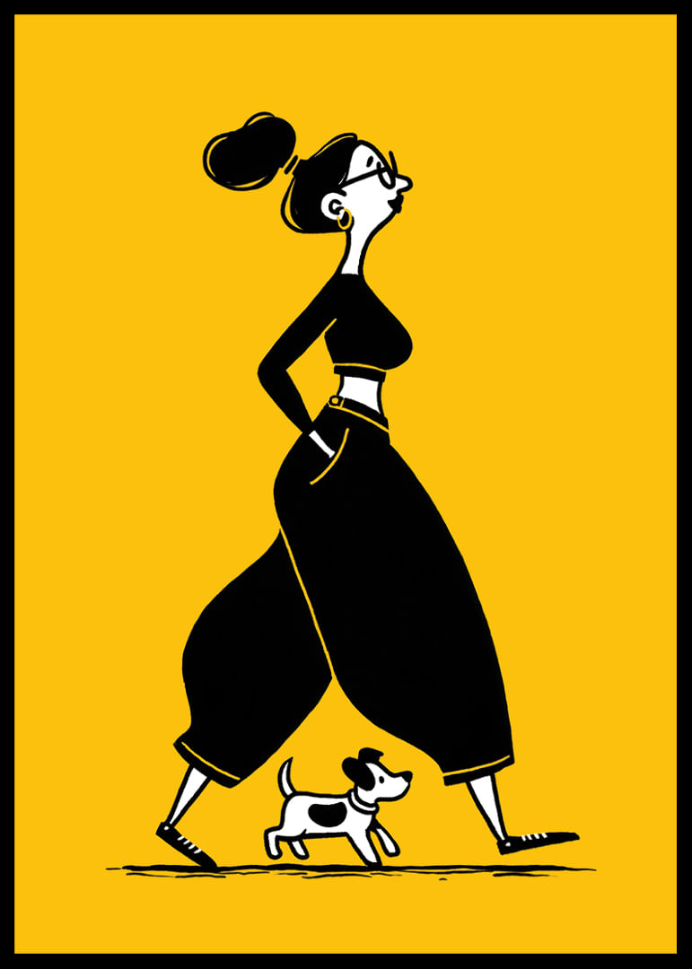 Denna poster fångar en elegant siluett av en kvinna och hennes lilla hund på en färgstark bakgrund. Det kraftiga gula lyfter fram de svarta konturerna och ger en modern och livlig känsla. Kvinnan utstrålar självsäkerhet och stil i varje steg. Postern blir ett dynamiskt inslag i ditt hem, perfekt för att lägga till en touch av sofistikation och urban charm till din inredning