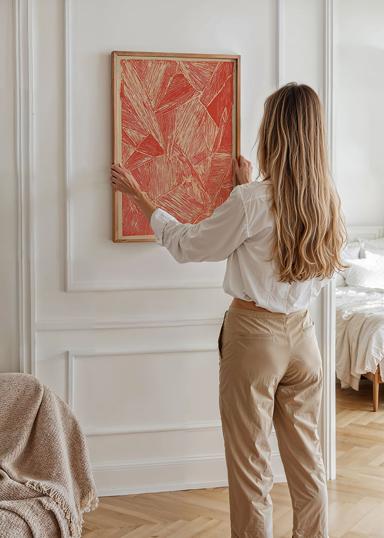 Denna poster fångar betraktaren med sina dynamiska, diagonala linjer i en djup röd färg, som skapar en känsla av energi och rörelse. Den abstrakta designen väcker fantasin och kan ge liv och värme till vilket rum som helst. Med sitt konstnärliga uttryck förvandlar denna poster hela atmosfären i ditt hem och fungerar som en kraftfull visuell mittpunkt för alla moderna inredningar