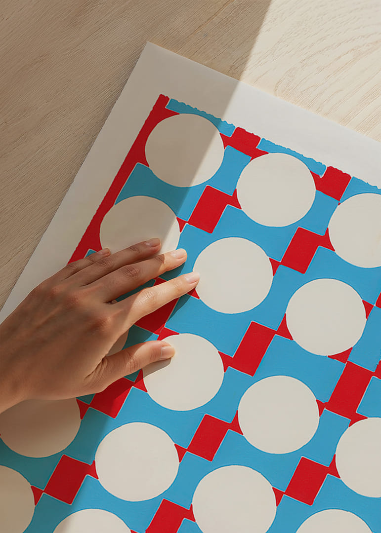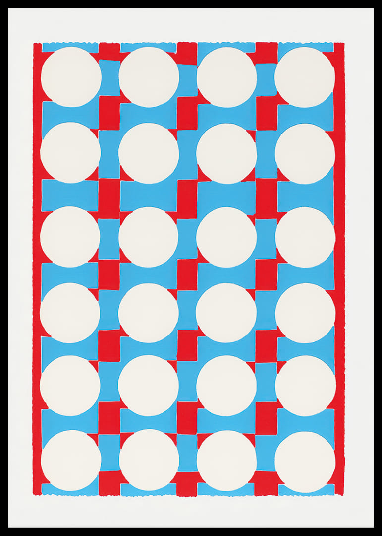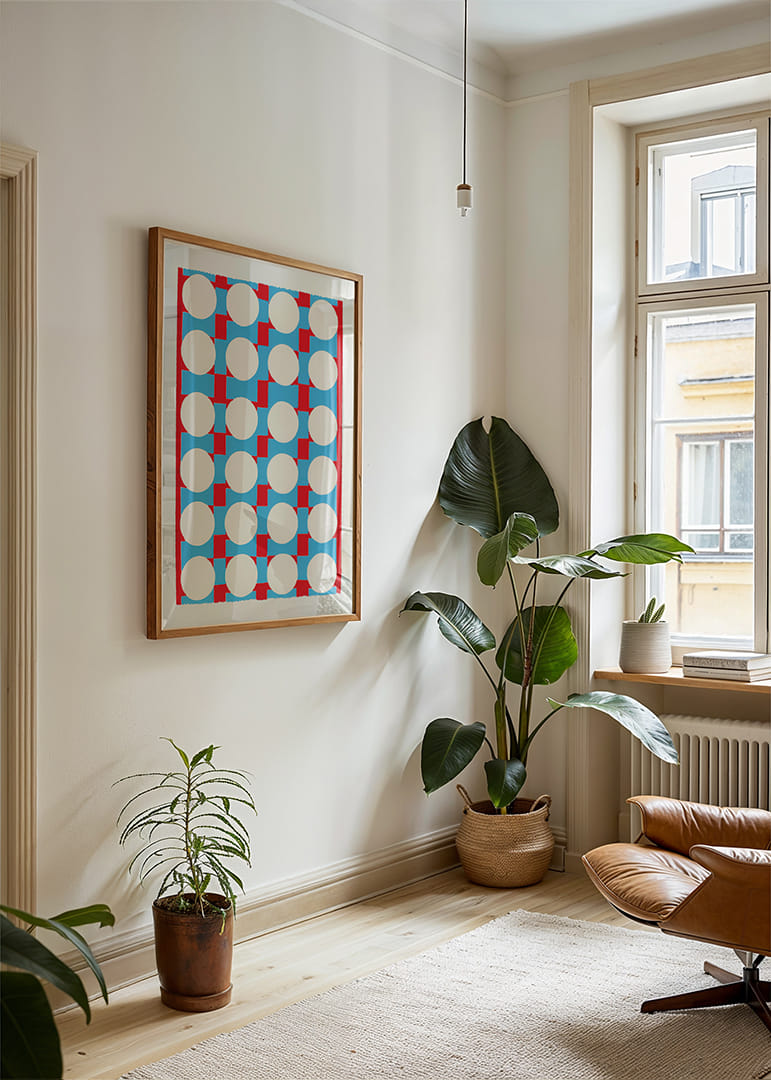Denna poster fångar omedelbart uppmärksamhet med sina djärva färger och geometriska former. Den livfulla kombinationen av rött, blått och vitt i ett lekfullt mönster av cirklar skapar en dynamisk känsla av rörelse. Postern ger ett modernt och stilrent uttryck, perfekt för att ge energi och liv åt vardagsrummet eller arbetsplatsen. Den stilfulla designen blir en central punkt i vilket rum som helst