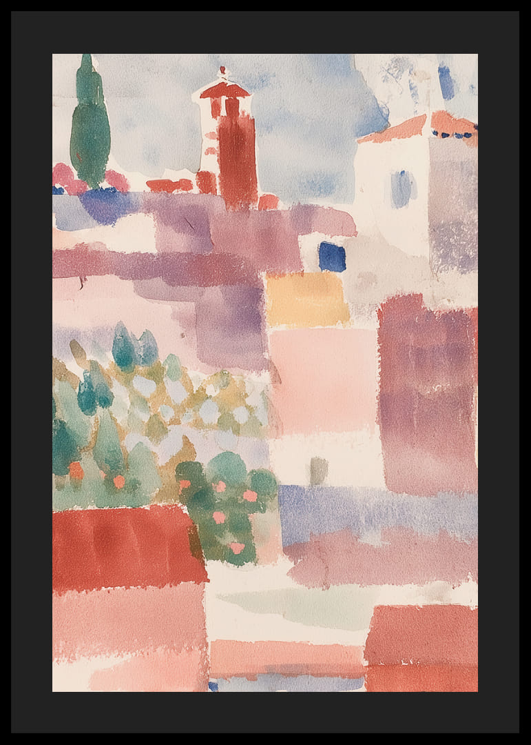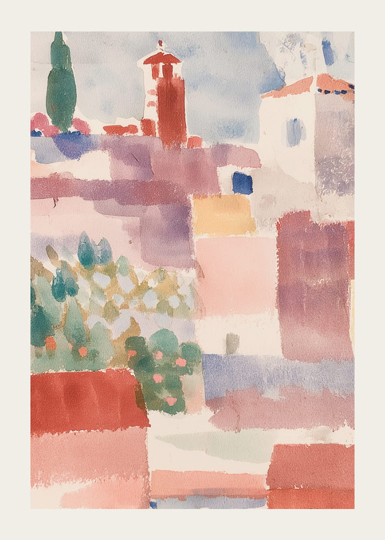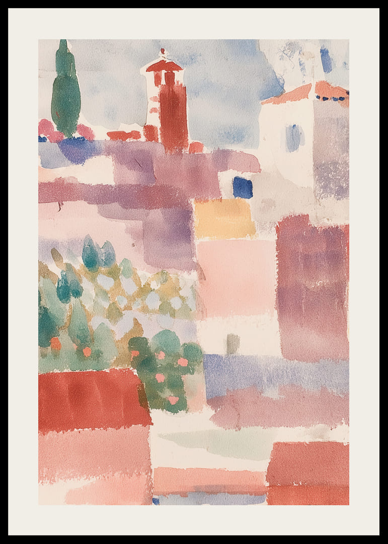 Pastellfärger av solvarma röda, mjuka rosa och skymtande grönt flödar över denna poster och framkallar en känsla av lugn och enkelhet från en avlägsen medelhavsby. De svala nyanserna och lätta penseldragen transporterar betraktaren till en plats av drömska vyer och avslappning. Denna poster skänker en subtil elegans och fridfull atmosfär till vilket rum den än pryder