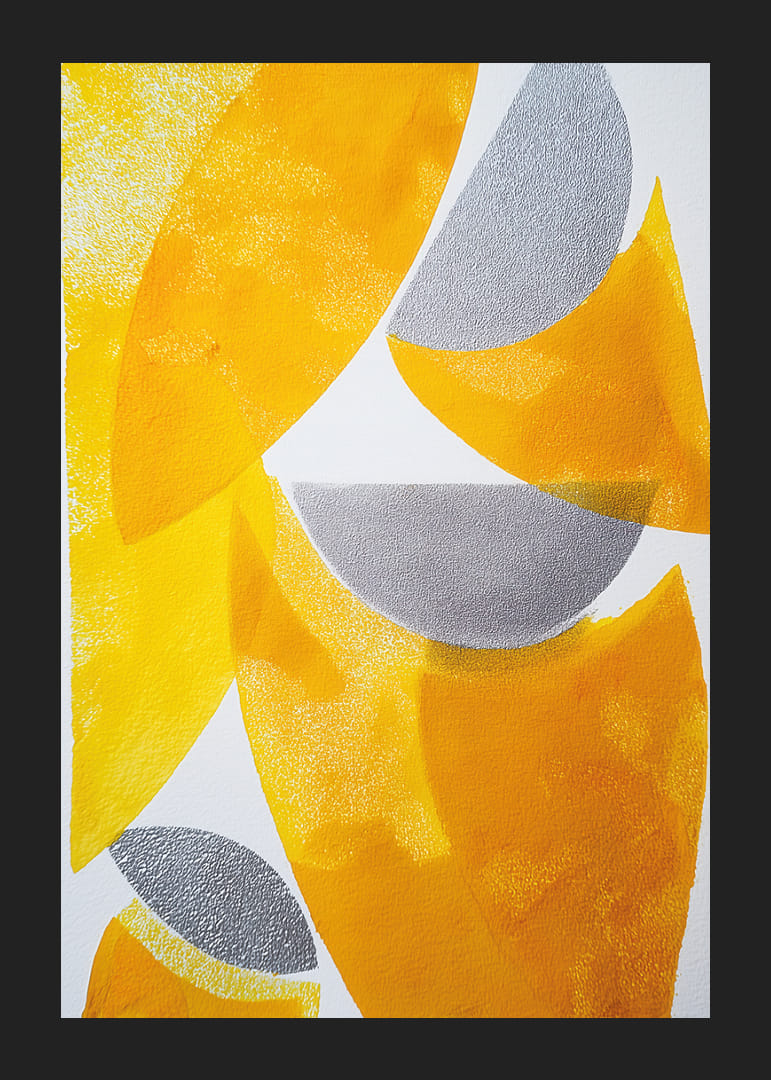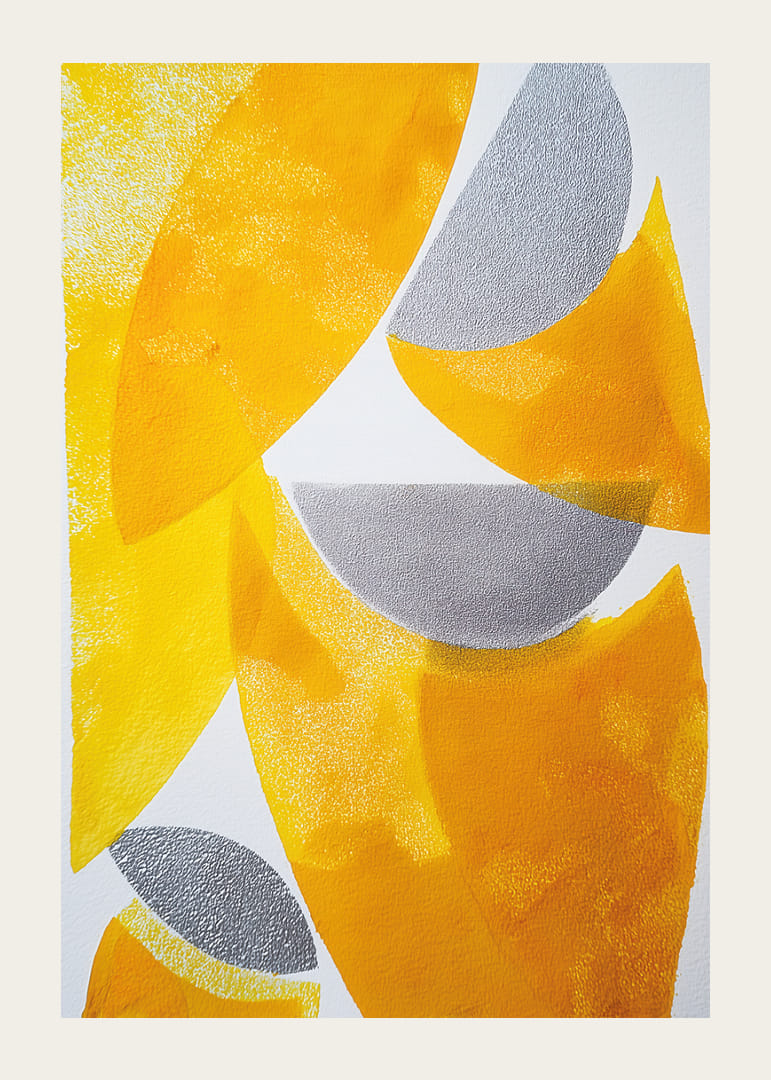 Denna poster fångar uppmärksamheten med sina abstrakta gyllene och grå former som smälter samman i en balans mellan energi och stillhet. De ljusa färgerna leker med ljuset och skapar en dynamik som förhöjer rummets atmosfär. Postern tillför en modern känsla och värme, perfekt för att ge liv åt en minimalistisk inredning och addera en touch av sofistikerad konst