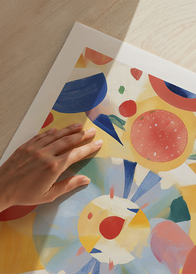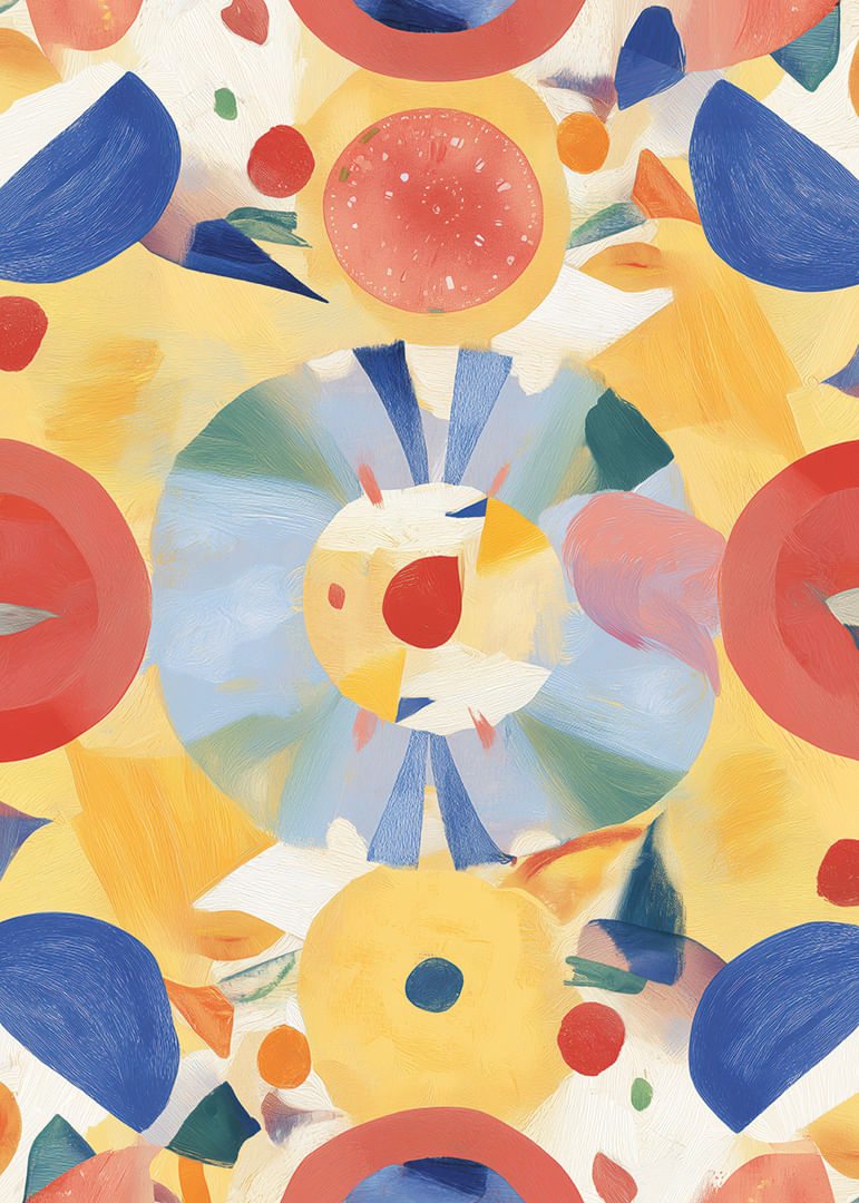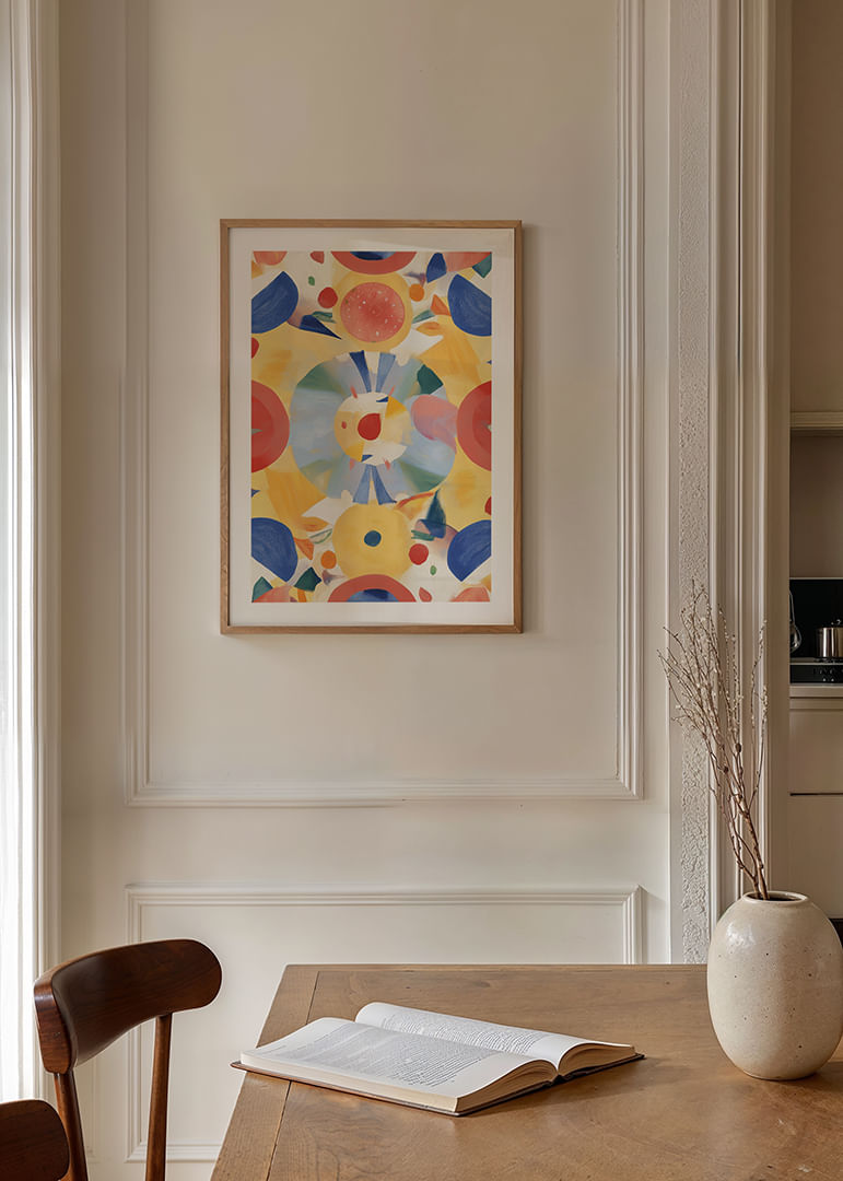 Denna poster fångar ögat med sitt färggranna och dynamiska mönster av cirklar och geometriska former. De klara nyanserna av blått, rött och gult skapar en känsla av rörelse och glädje. Posters unika design gör den till en perfekt samtalsstartare som livar upp vilket rum som helst. Med sin harmoniska kombination av form och färg tillför den konstnärlig elegans och energi till din inredning