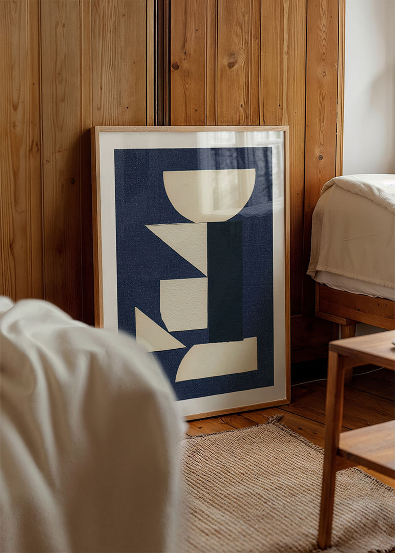 Denna poster fångar blicken med sina eleganta geometriska former mot en djup mörk bakgrund. Varje form samspelar och skapar en känsla av balans och lugn. Det minimalistiska uttrycket ger en sofistikerad atmosfär som lätt förvandlar vilket rum som helst. Postern är perfekt för den stilmedvetna som vill tillföra ett element av stilleben och konstnärlig finess till sin inredning
