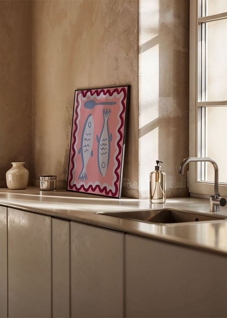 Denna poster fångar ögat med sina två stiliserade fiskar i en harmonisk pastellpalett. De mjuka tonerna av blått och rosa skapar en lugn och inbjudande atmosfär. Detta konstverks lekfulla design ger både en fräsch och avslappnad känsla, perfekt för att lyfta livets enklare stunder. Postern passar utmärkt i köket eller matsalen för att ge en subtil maritim touch som berikar rummet med sin stillhet.