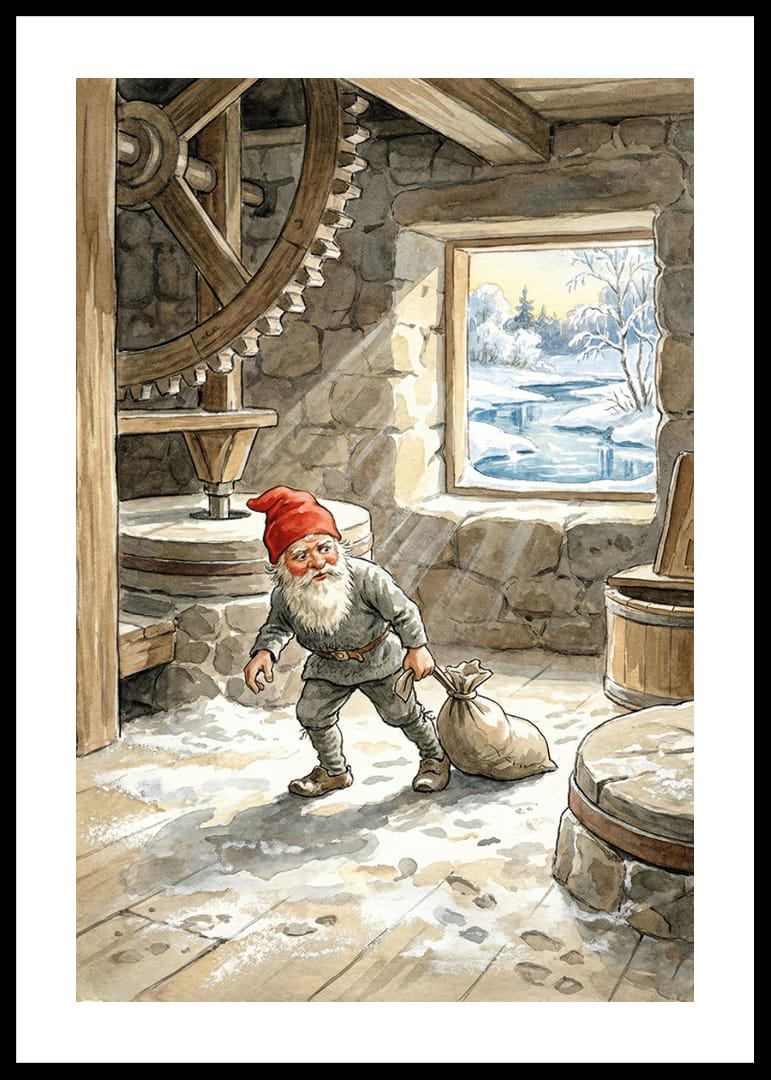 Denna poster fångar en magisk vinterdag där en tomte arbetar i en gammal kvarn. Med varm detaljrikedom syns det snötäckt landskap utanför och den rustika stenkvarnens inre, med trägolv och stora kugghjul. Tomtens röda mössa och grå kläder ger en stämningsfull kontrast till det bleka vinterljuset. Postern sprider en känsla av ro och gammaldags charm, vilket förhöjer atmosfären i vilket rum den än placeras