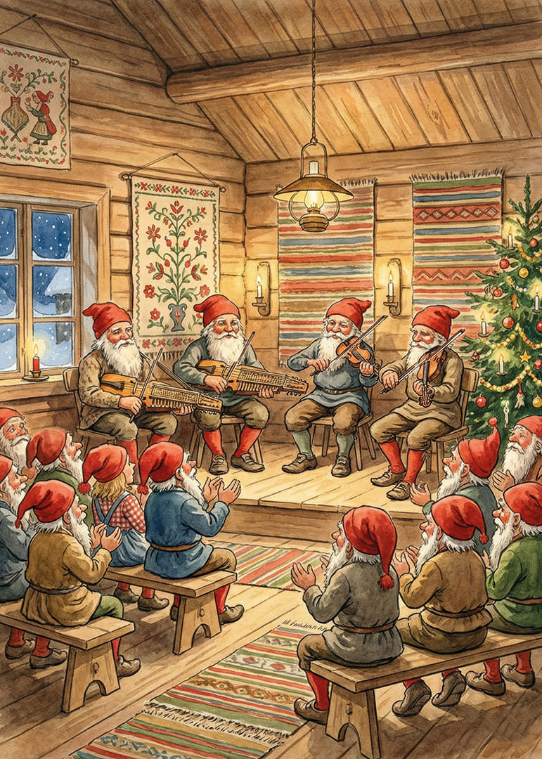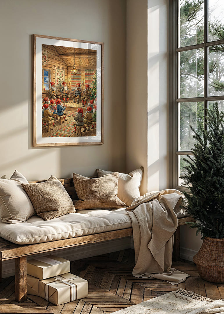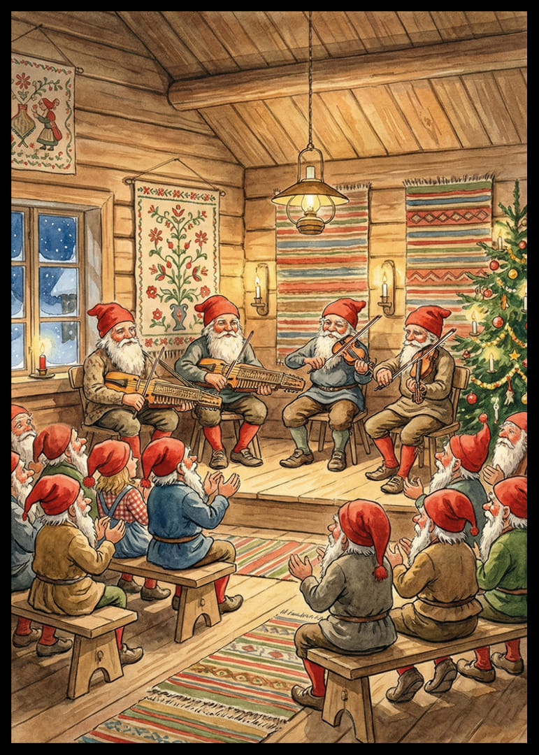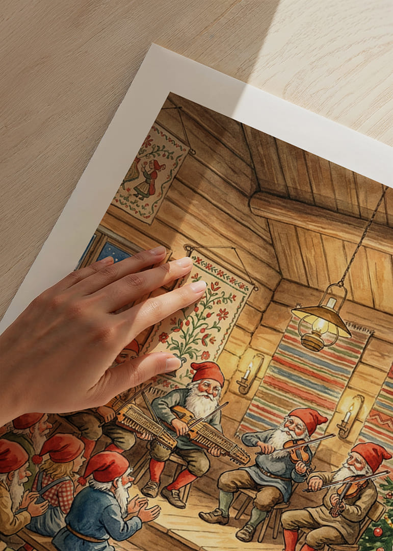 Med en varm inbjudan drar denna poster betraktaren in i en förtrollande julscen där tomtar spelar folkmusik i en rustik, träklädd stuga. Detaljerade juldekorationer och den festliga atmosfären ger en känsla av tradition och glädje. Denna posters charm förstärker alla rum, fyller dem med nostalgisk värme och sprider en välkomnande julstämning som gör varje hem mer inbjudande
