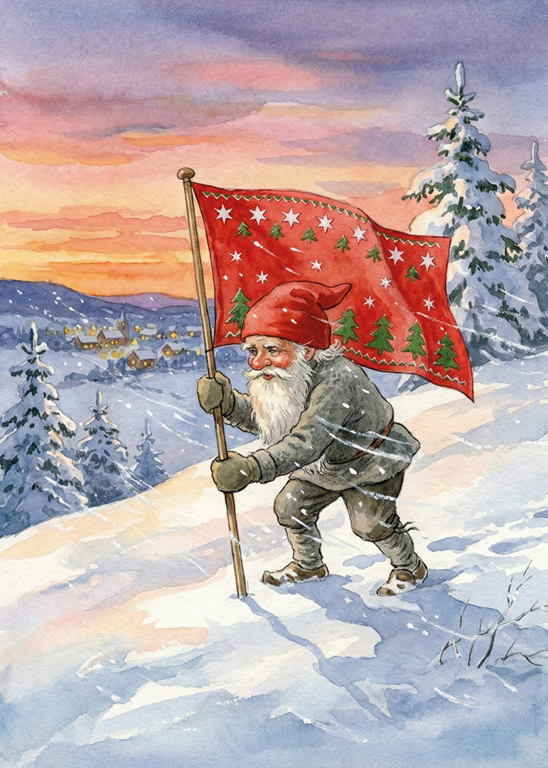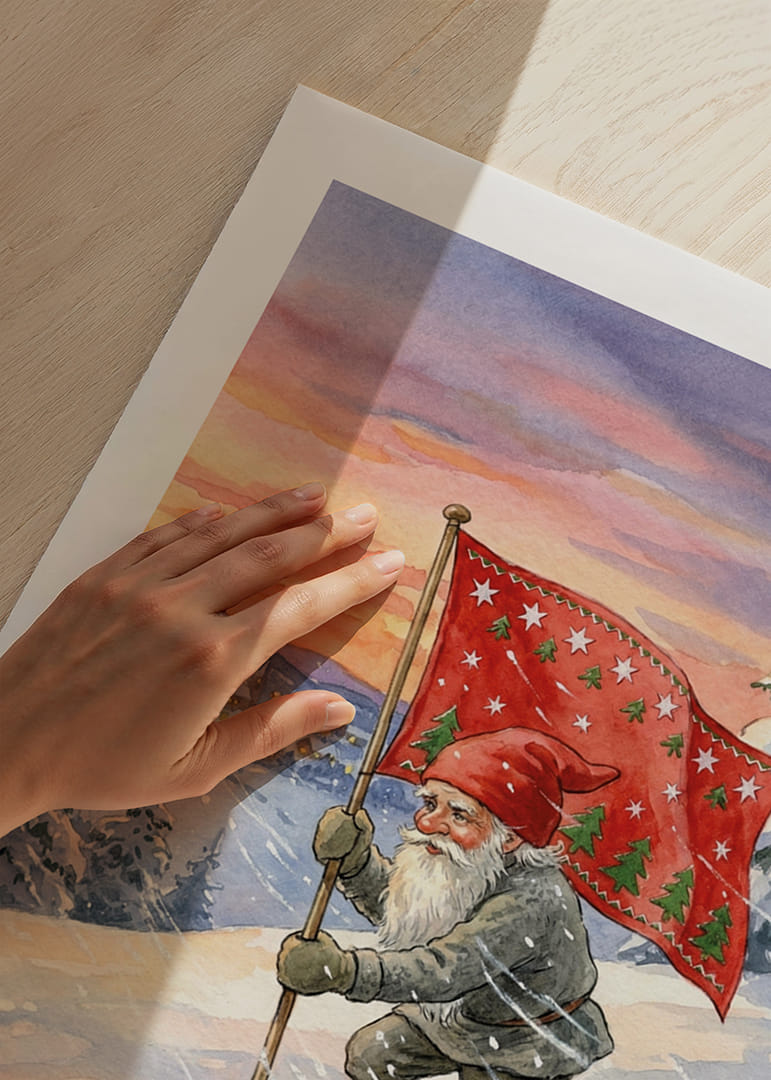 Den här postern fångar en magisk vintervärld där en tomte stolt bär en flagga dekorerad med stjärnor och granar. Den dramatiska himlen målas i varma rosa och orange nyanser, vilket skapar en underbar kontrast mot det kalla, vita snölandskapet. Denna poster skapar en känsla av tradition och mystik, vilket ger varje rum en mysig och sagolik atmosfär