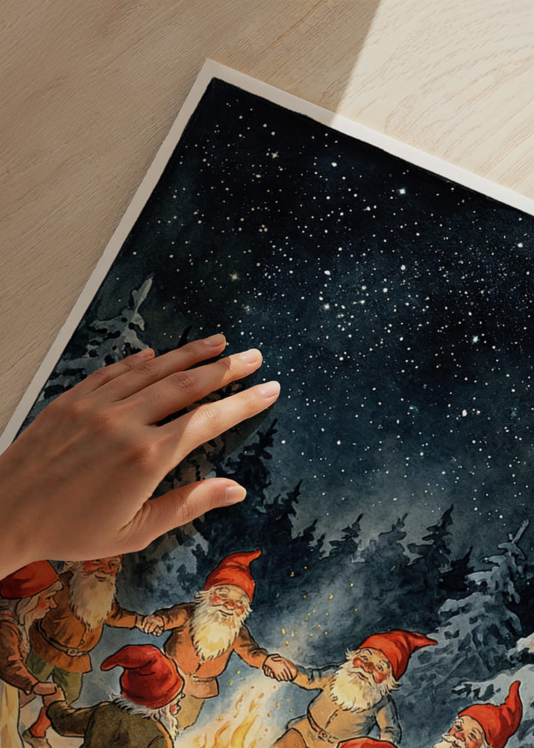 Denna poster fångar magin i vinternatten med tomtar som dansar runt en sprakande eld under en glittrande stjärnfylld himmel. De röda mössorna och den gnistrande snön skapar en känsla av värme och gemenskap trots den kalla natten. Perfekt för att tillföra en mysig och charmig atmosfär i vilket rum som helst där vinterns fröjd och fantasi fångas i en tidlös bild