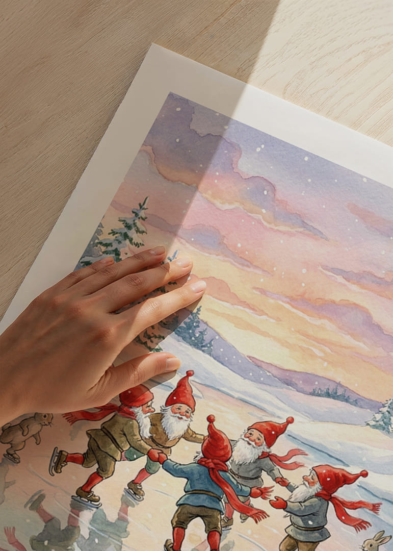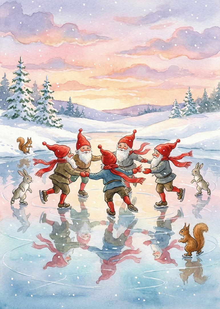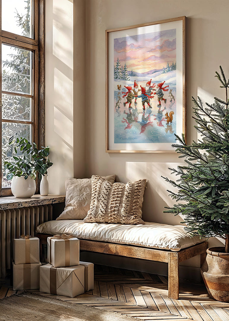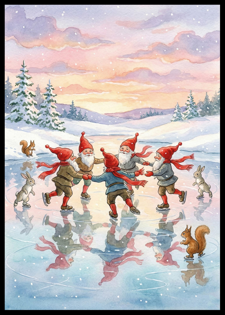 Denna affisch fångar charmen av ett magiskt vinterlandskap där fyra tomtar i glada röda hattar dansar på glittrande is. Med pastellfärgade himlar och omgivande snötyngda granar skapas en drömlik och lekfull atmosfär. Reflektionerna på isen förstärker den fantasifulla känslan, vilket gör denna affisch till ett förtrollande tillskott i alla hem som söker värme och glädje under vintern