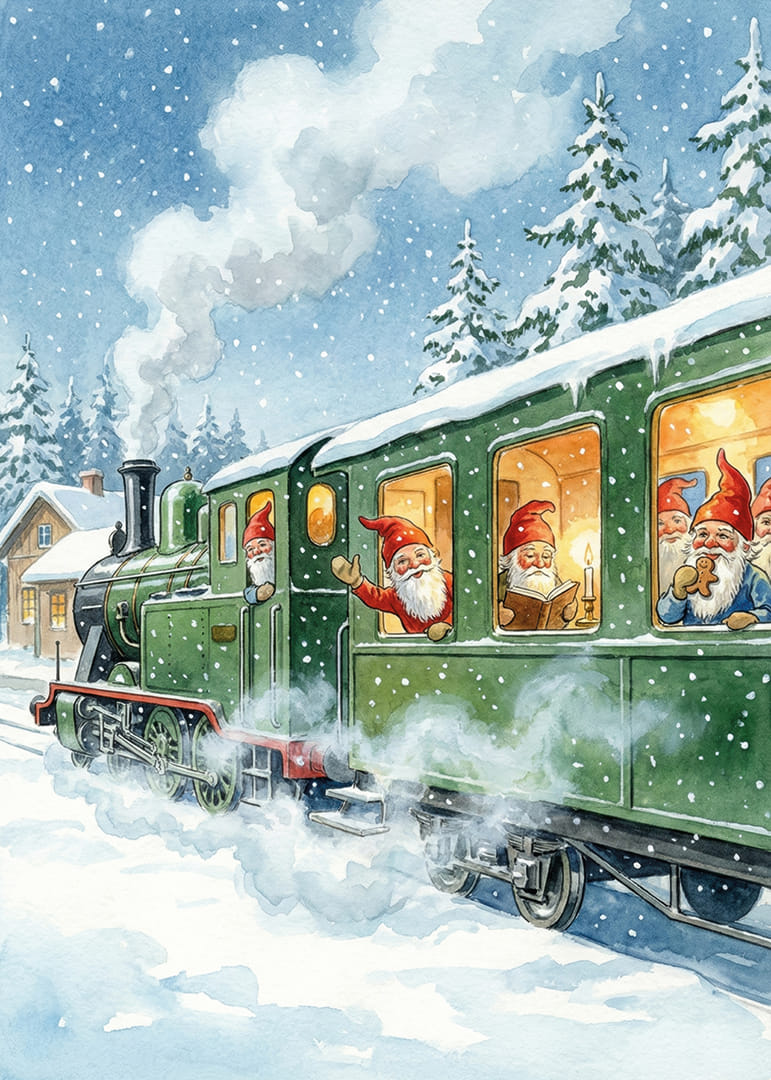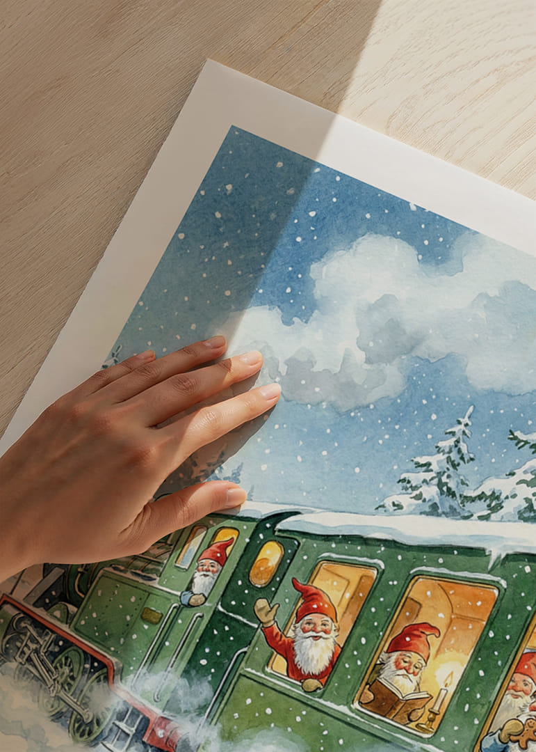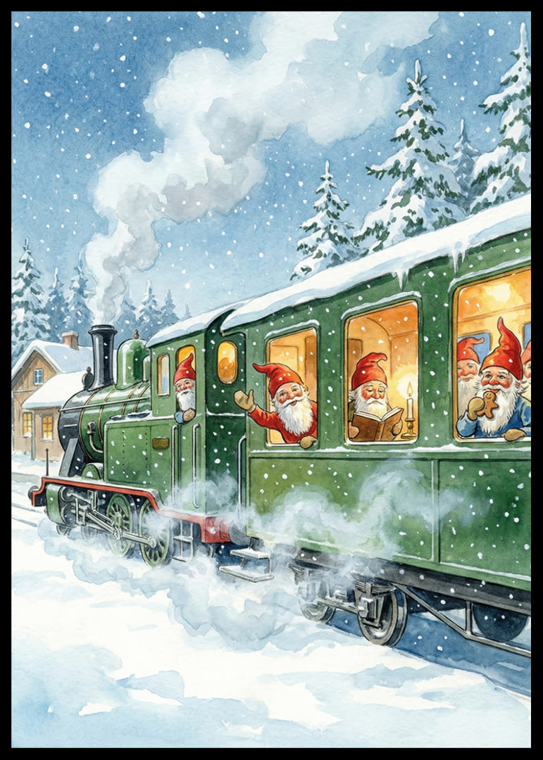 Denna poster fångar en magisk vinterresa där glada små tomtar tittar ut från ett ångande grönt tåg som susar genom ett snöklätt landskap. Med sin charmiga stämning och detaljerade illustrationer sprider postern värme och glädje. Perfekt för att förvandla vilket utrymme som helst till ett rum fyllt med fantasi och festlig anda, passar den underbart i alla hem för en känsla av julens magi