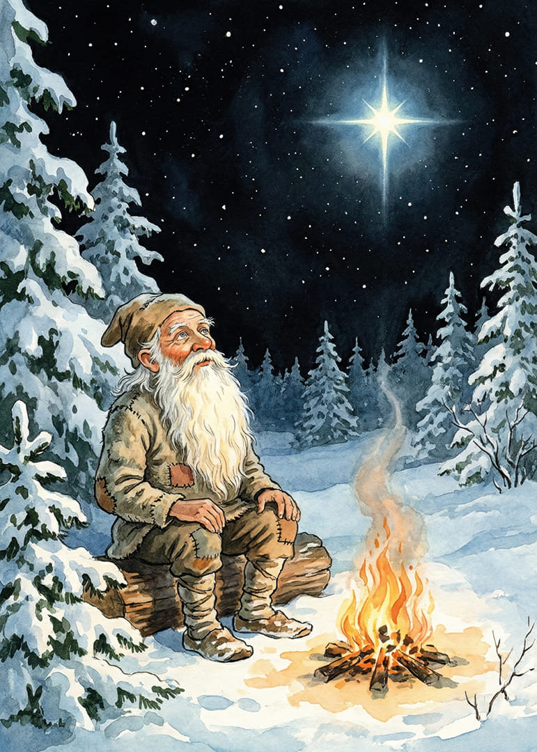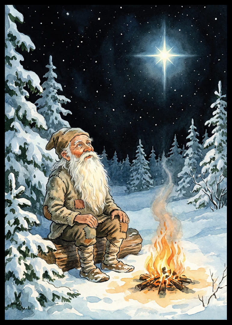 Mitt i en fridfull skog sitter en gammal man vid en sprakande lägereld och blickar upp mot den majestätiska stjärnhimlen. Den gnistrande snön omfamnar det nattliga landskapet, vilket ger en känsla av stillhet och ro. Denna poster fångar en magisk stund av ensamhet och reflektion, där naturens skönhet och stjärnornas ljus förvandlar ett rum till en plats av lugn och inspiration
