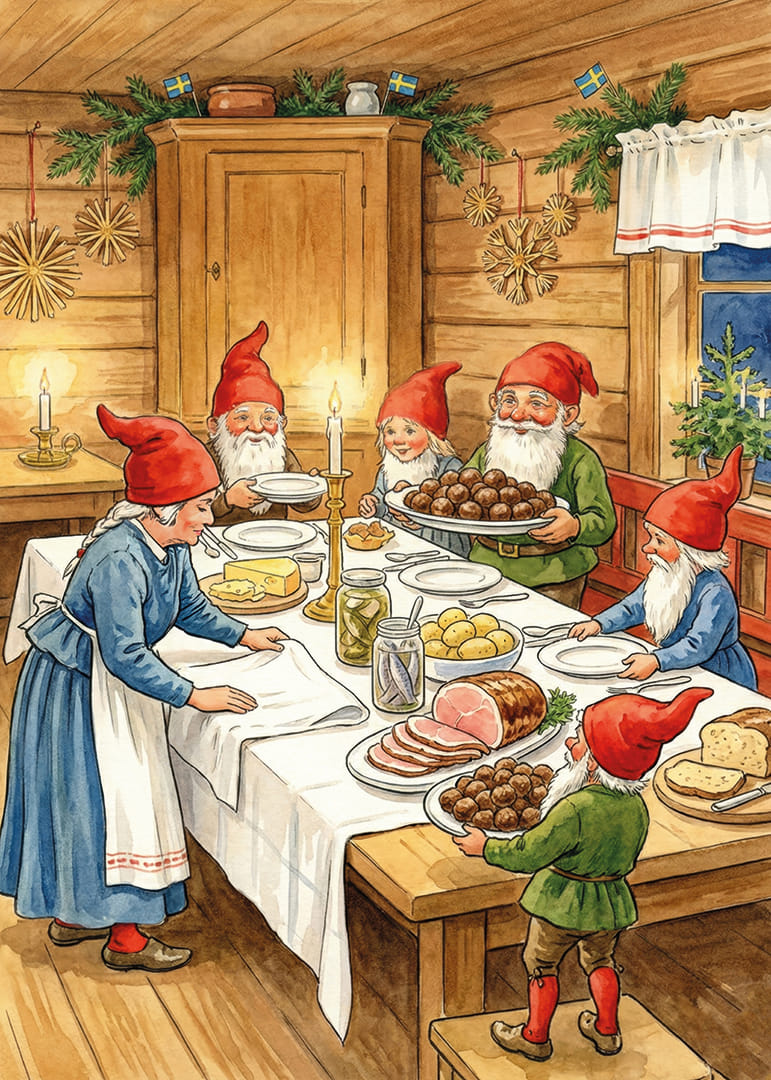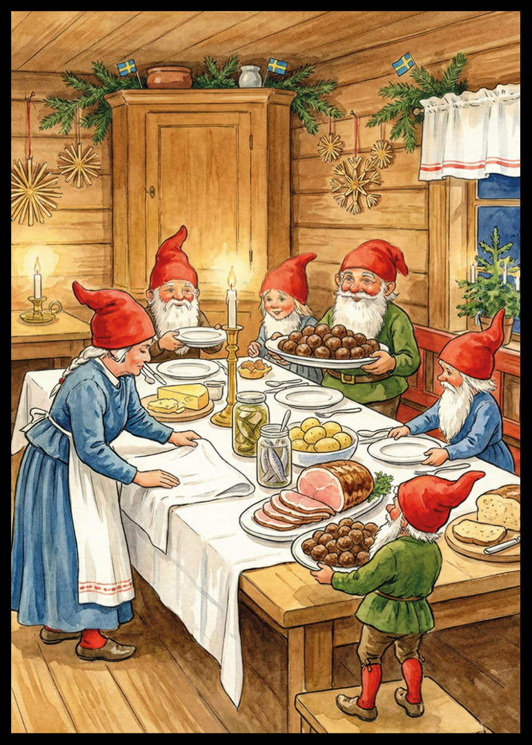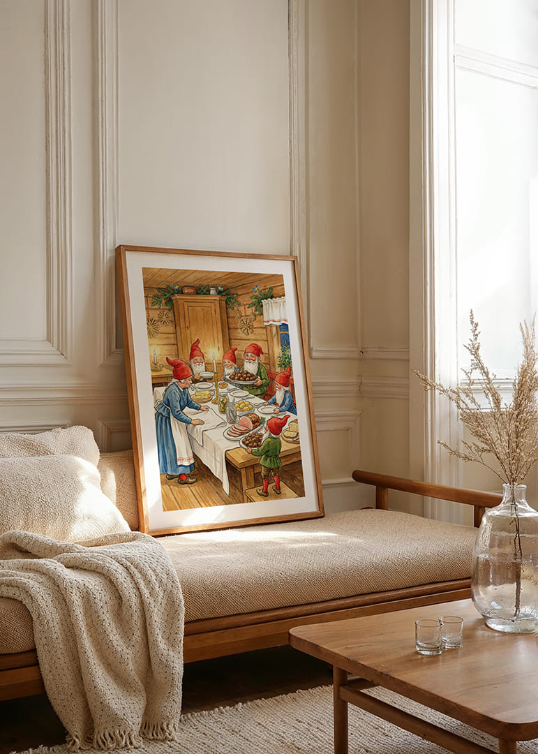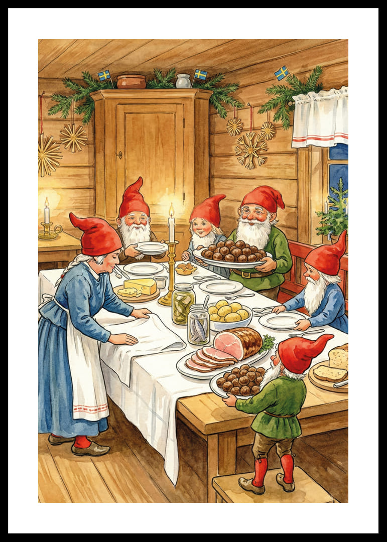 Denna underbara poster fångar den magiska stämningen av en traditionell nordisk jul. En grupp glada tomtar samlas kring ett bord fullt av julmat, med inslag av grönt granris dekorerat i bakgrunden. Ljuset från stearinljusen skapar en varm och inbjudande atmosfär. Denna poster sprider glädje och gemenskap och ger varje hem en känsla av tradition och julstämning som varar hela säsongen