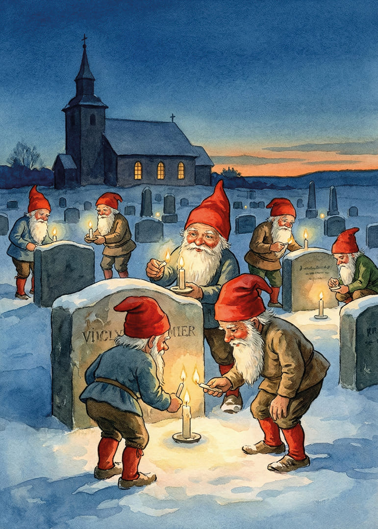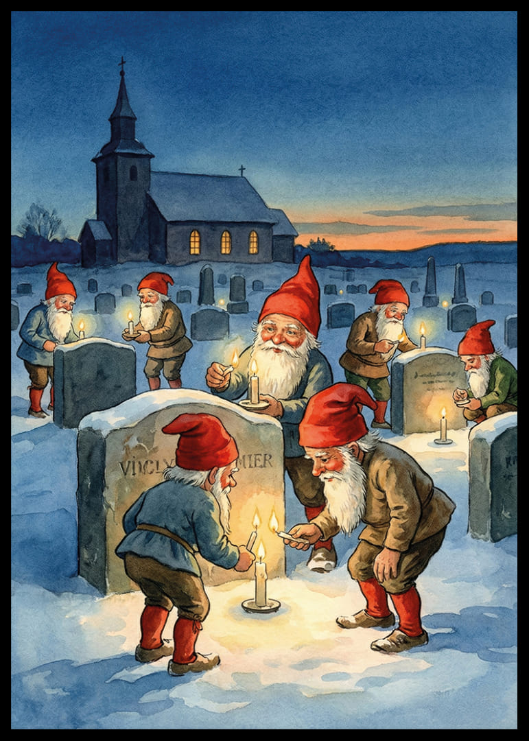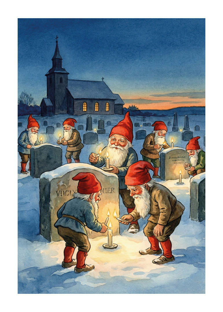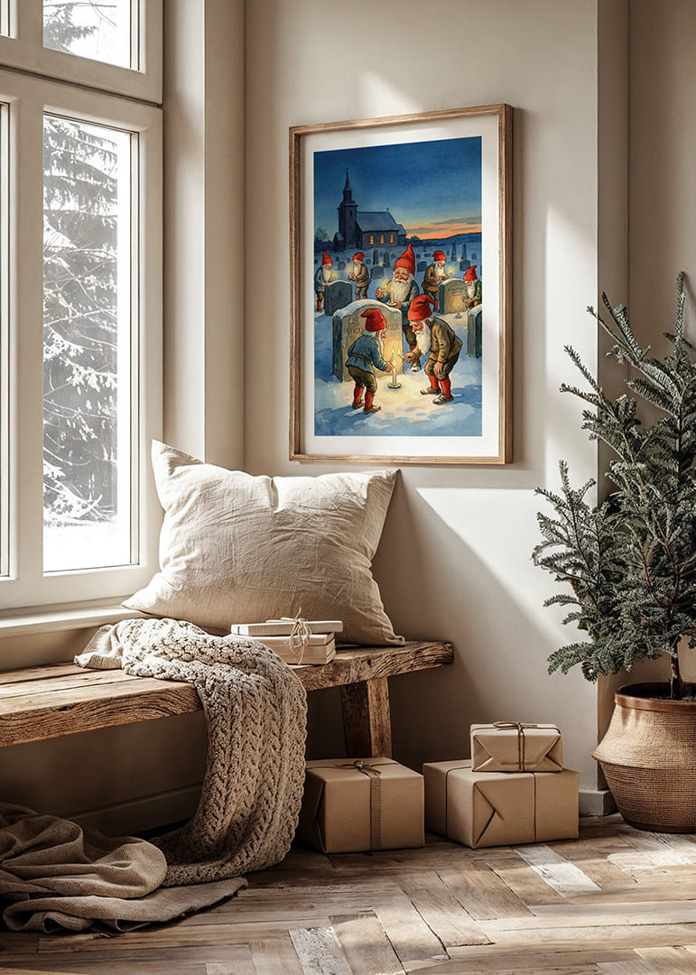 Denna magiska poster fångar en grupp gnomer som med omsorg tänder levande ljus vid gravstenar i det tysta vinterlandskapet. Skymningen skapar en mystisk och varm atmosfär medan kyrkans silhuett vakar i bakgrunden. Denna poster ger en känsla av stillhet och traditionell skönhet och kan förvandla vilket rum som helst till en plats för reflektion och fridfull eftertanke