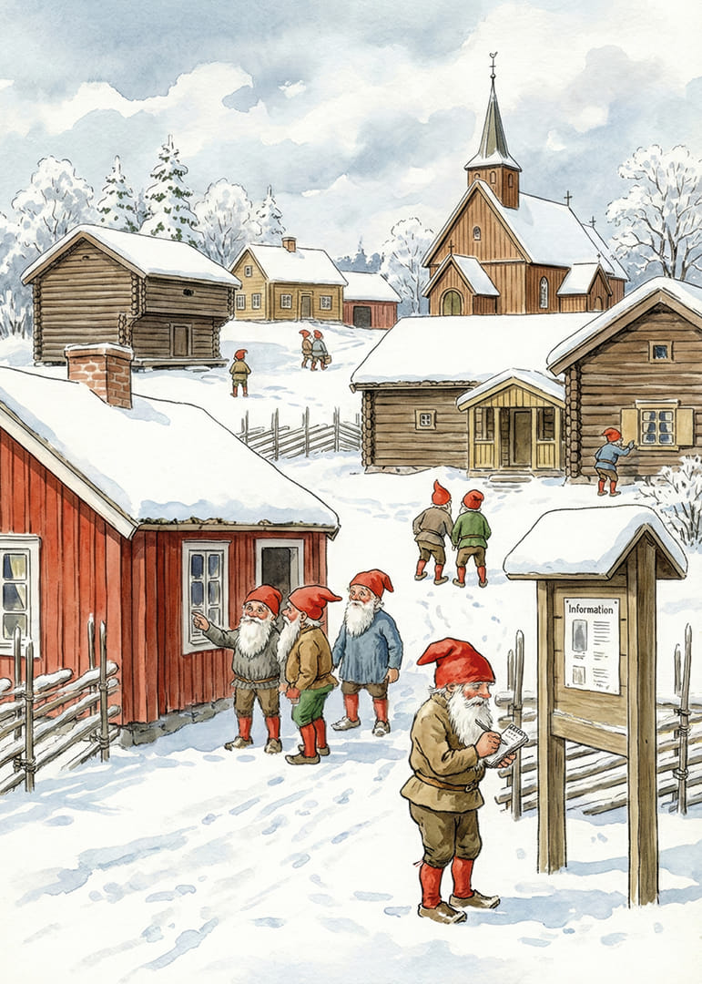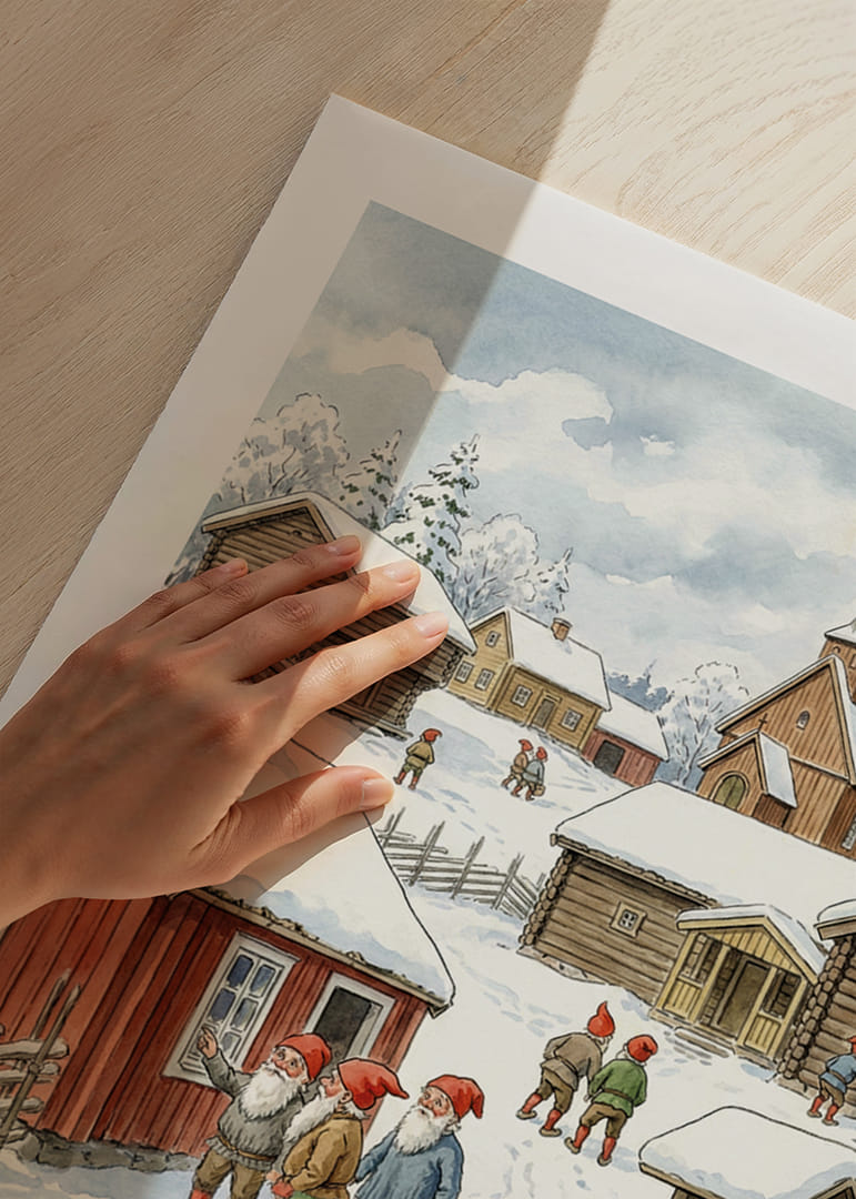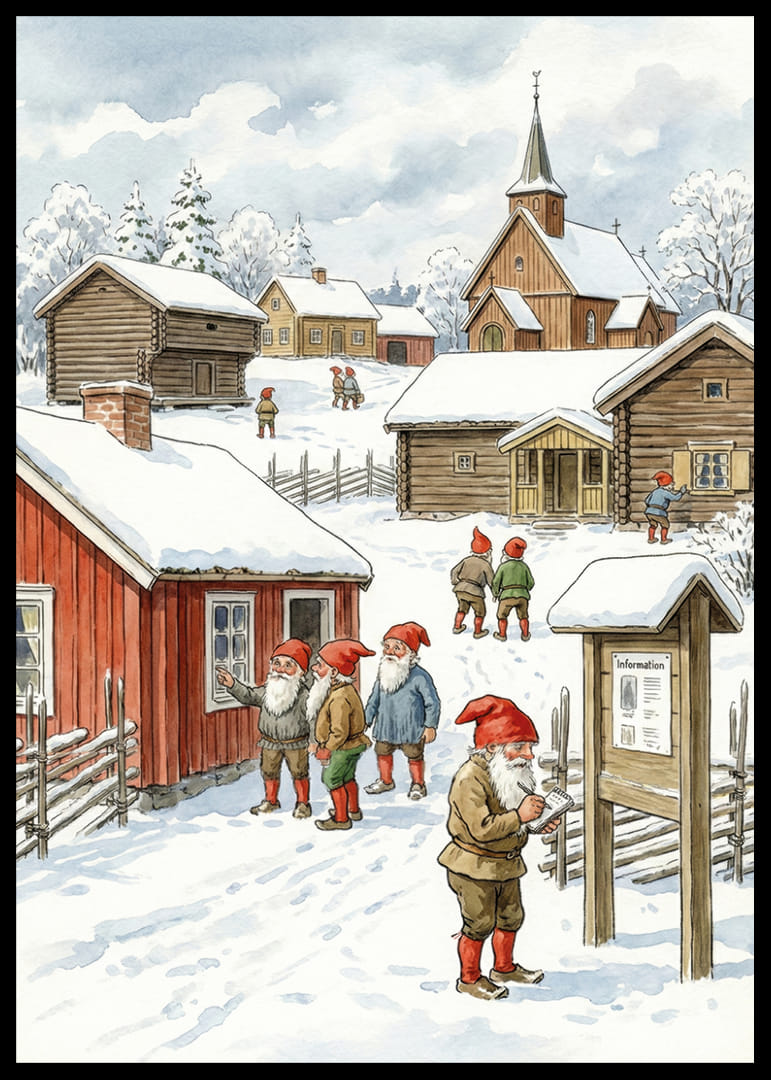 Denna poster fångar en magisk vinterscen med charmiga tomtar som strövar omkring i ett pittoreskt samhälle. Den snöiga omgivningen och de traditionella stugorna skapar en känsla av värme och nostalgi mitt i vinterlandskapet. Färgglada röda hattar och skägg ger liv åt sceneriet och skapar en fantasifull atmosfär. Perfekt för att ge ditt hem en mysig, julig känsla med en touch av sagolik stämning