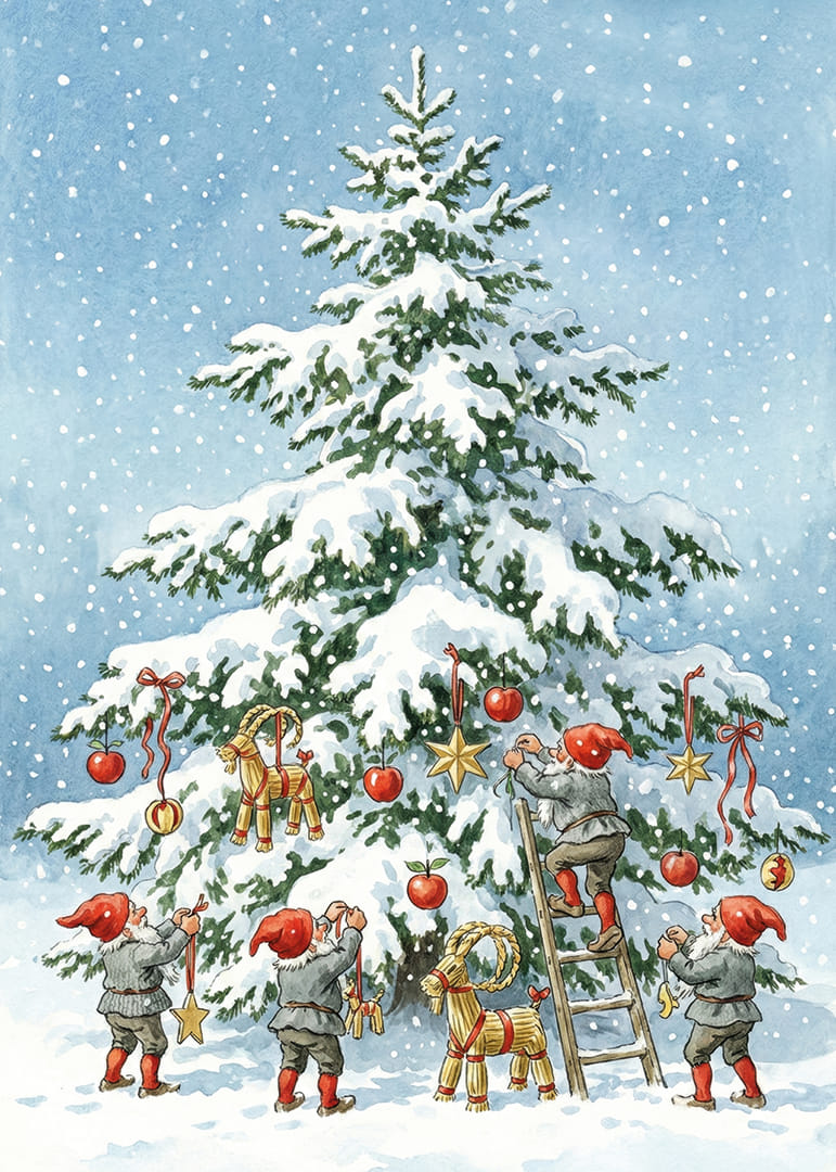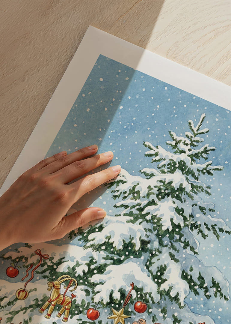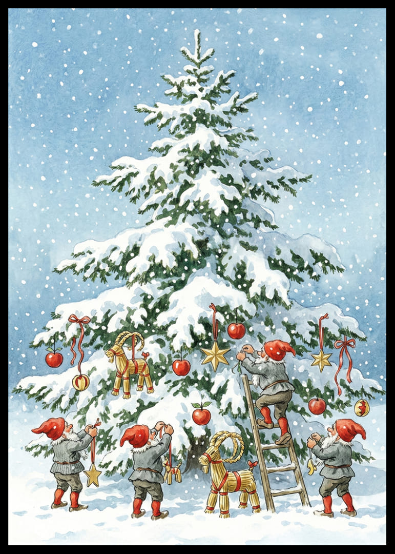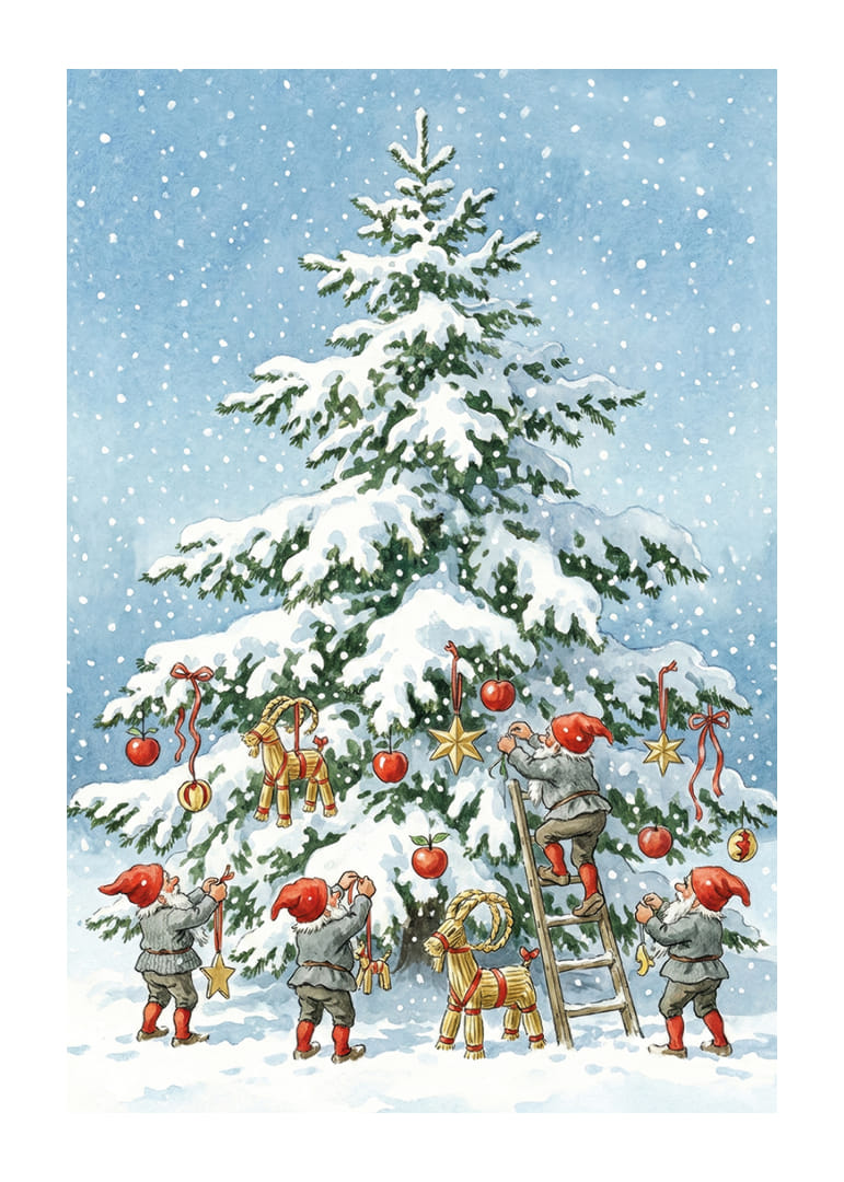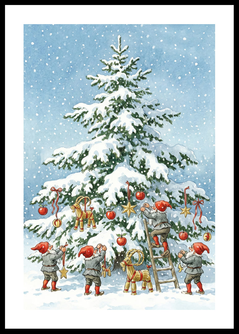 Denna poster fångar en magisk scen där tomtar i röda luvor entusiastiskt dekorerar en stor snötäckt gran med gyllene stjärnor och glittrande äpplen. Den blå himlen och mjukt fallande snöflingor fördjupar den vintriga atmosfären, vilket skapar en känsla av varm nostalgi. Perfekt för att ge en touch av traditionell julstämning till vilket rum som helst i hemmet