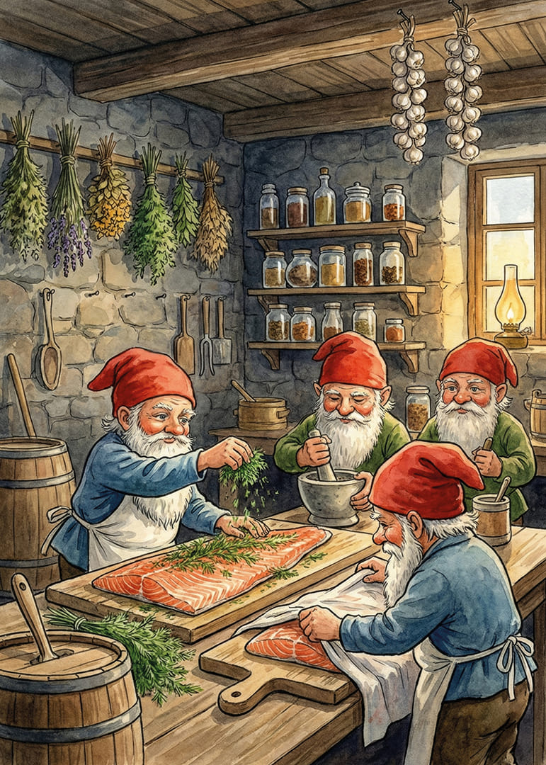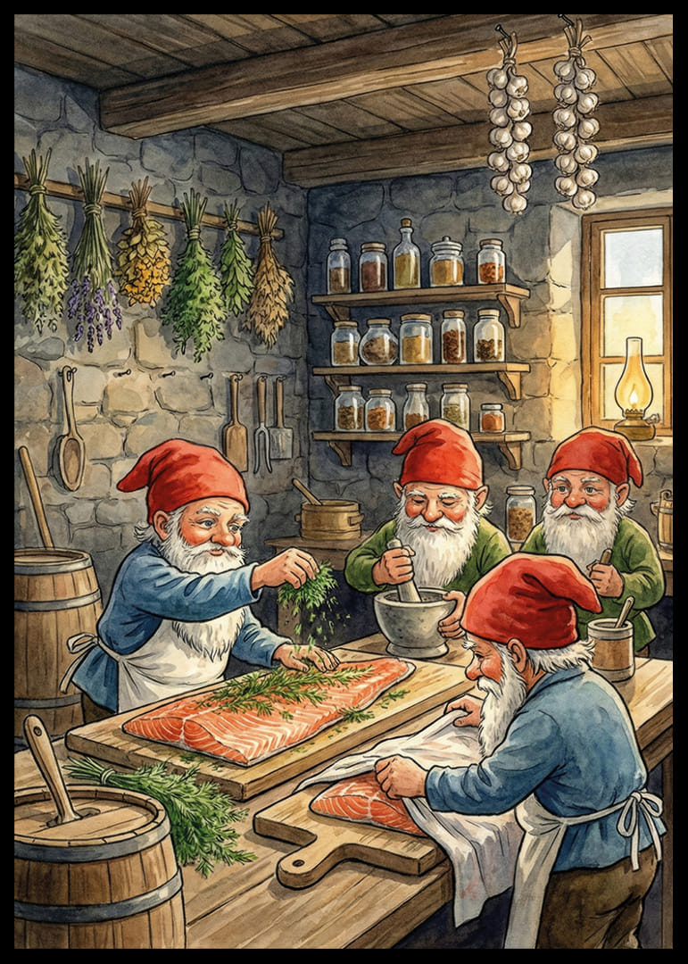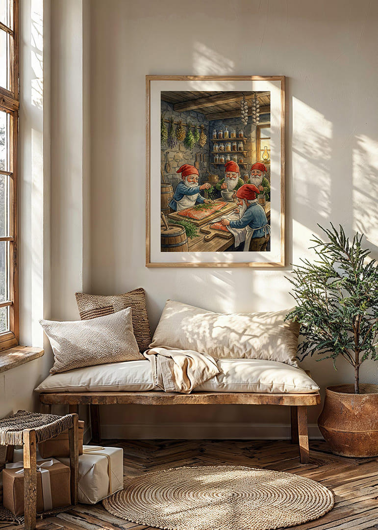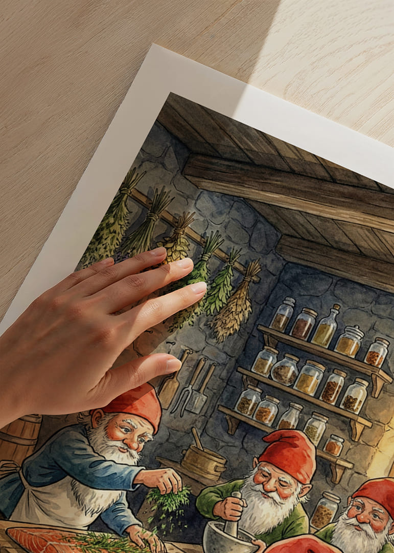 Denna poster fångar en varm och livfull scen där fyra tomtar i röda mössor tillagar festmåltider i deras rustika stuga. Stenmurarnas charm och de hängande örterna förstärker stämningen av magi och gemenskap. Färgerna är jordnära med inslag av grönt och rött, vilket skapar en behaglig balans. Perfekt i köket ger postern en känsla av hemtrevnad och kreativ inspiration i vardagen