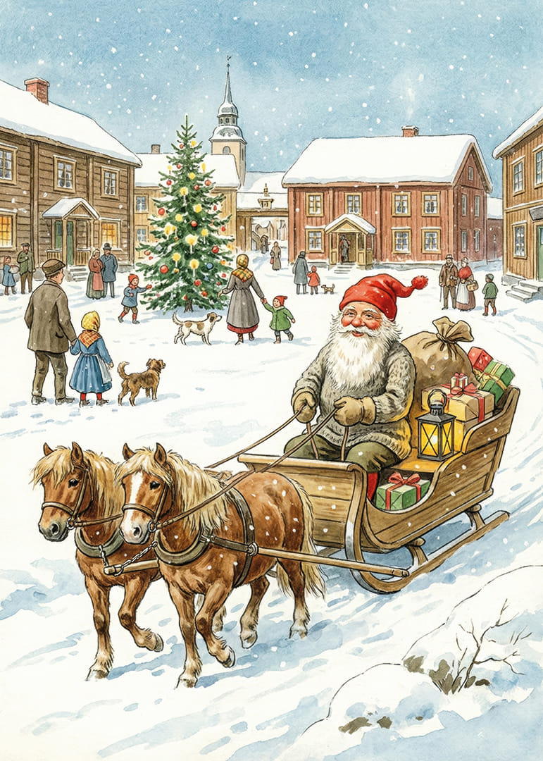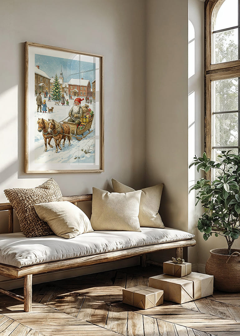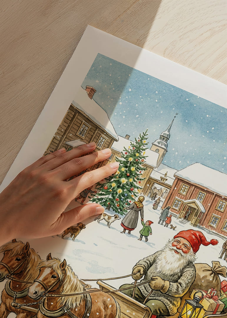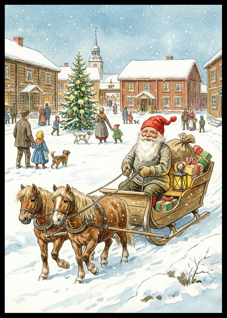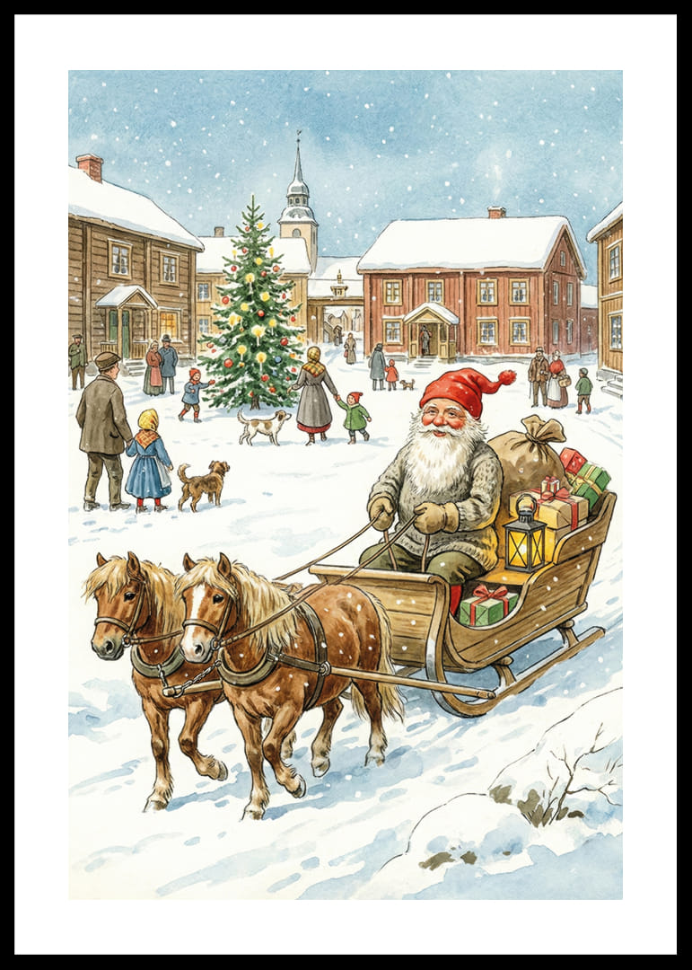 I denna förtrollande poster ser vi tomten omgiven av en idyllisk, snötäckt by där han färdas i sin släde dragen av pigga hästar. Den glittrande julgranen och de glada byborna förstärker den välkomnande känslan. Med ljus och färgglada paket sprider denna poster värme och julstämning, vilket gör den till ett härligt tillskott i hemmets vinterdekor och sprider en känsla av gemenskap