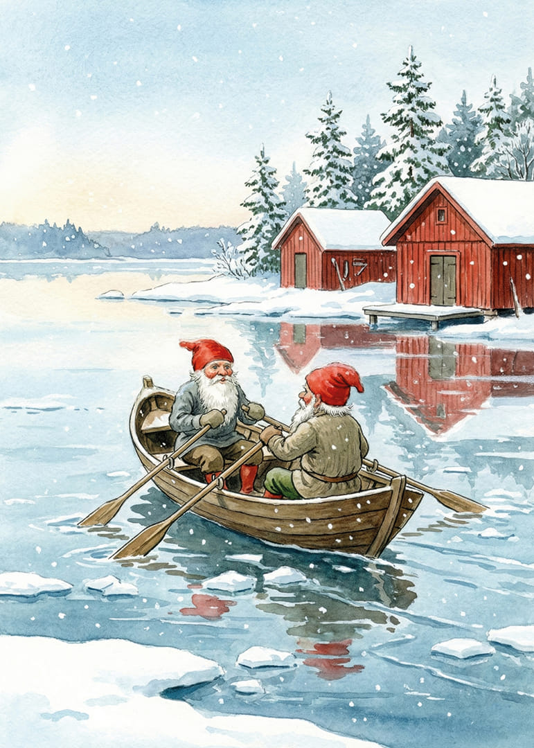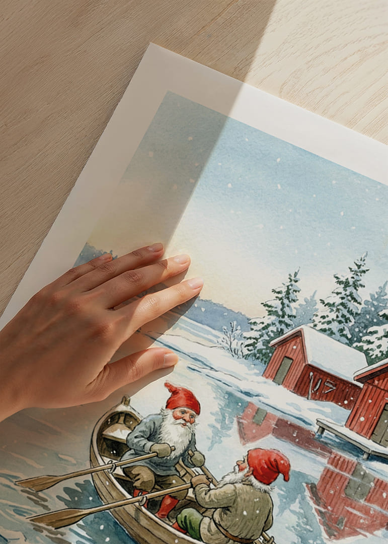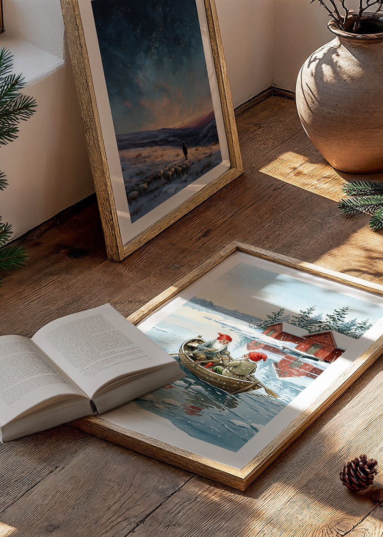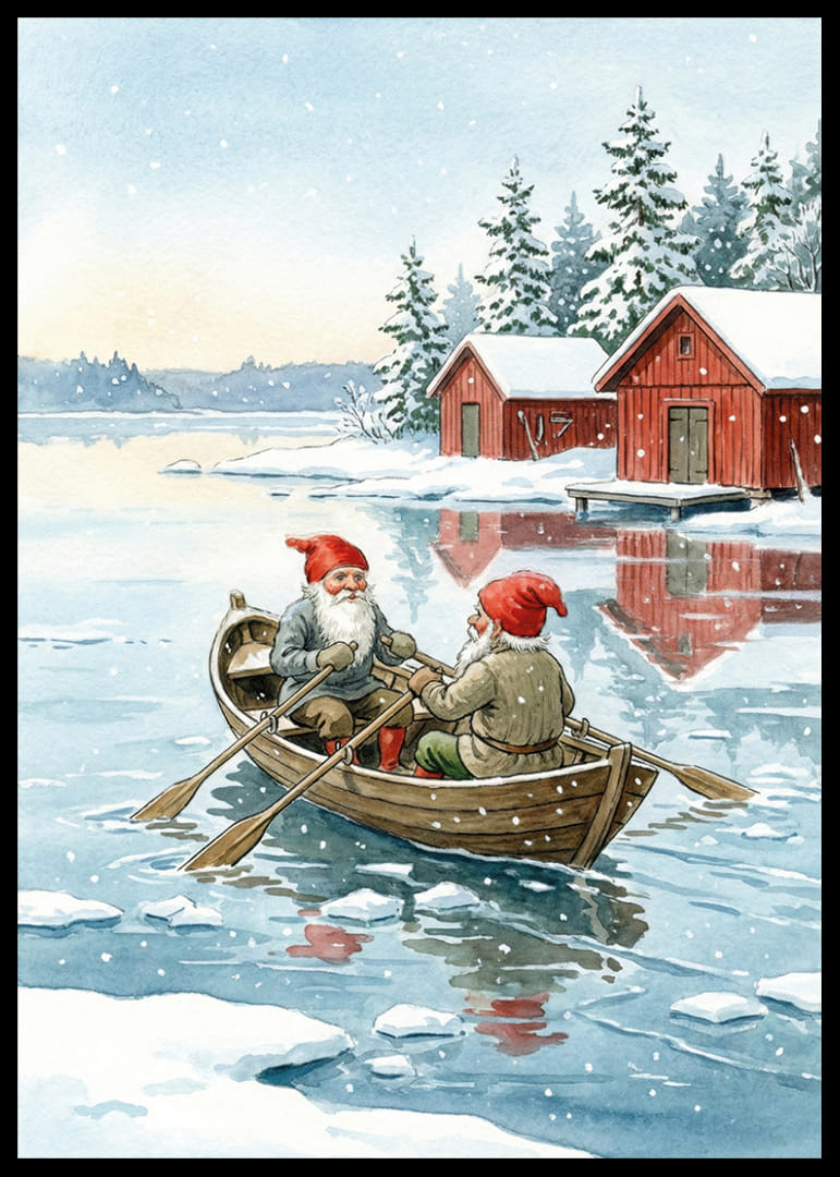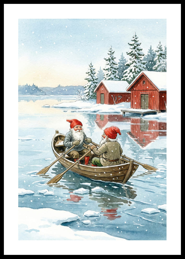 Denna poster fångar ett charmigt ögonblick av två tomtar som med varma leenden ror över en glittrande, frusen sjö. De röda stugorna i bakgrunden speglas vackert på den isiga ytan och skapar en nostalgisk vinterstämning. Med sin detaljrika konst och lugnande atmosfär blir postern en stämningsfull och förtrollande detalj som förvandlar vilket rum som helst till en vintersaga